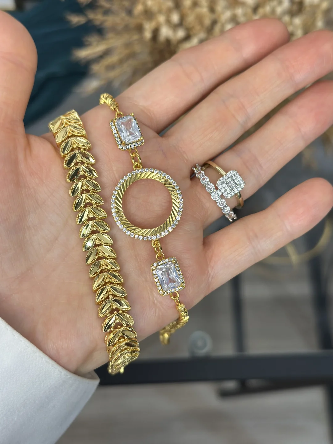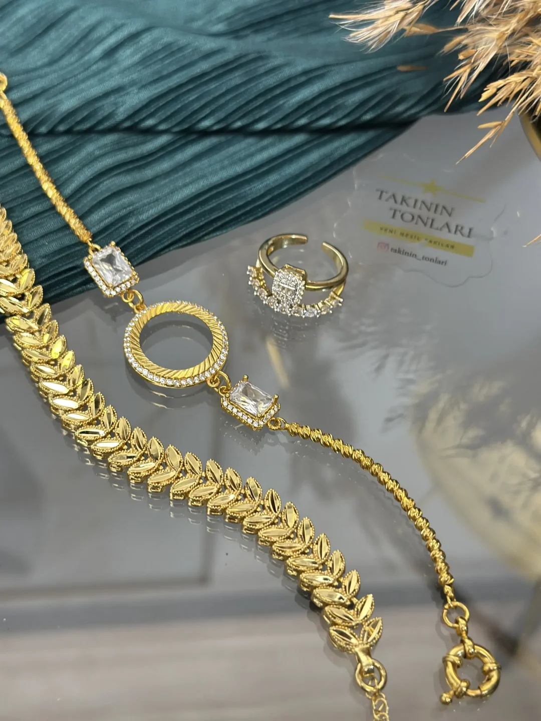 Paket İçeriği: 1 Adet Başak Bileklik + 1 Adet Baget Taşlı Çeyreklik Bileklik + 1 Adet Baget Yüzük