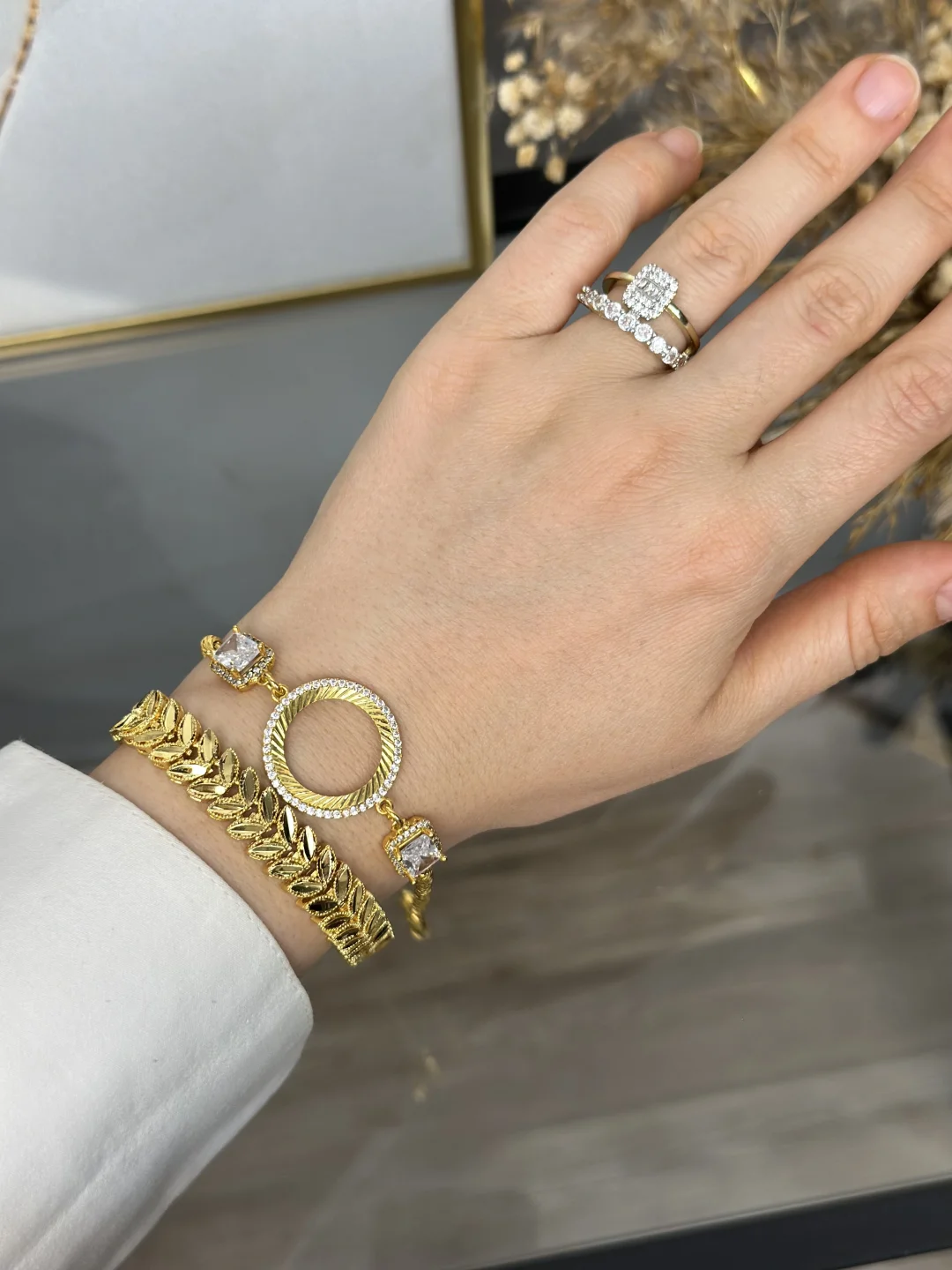 Bu set, tam 3 adet premium üründen oluşur: 2 adet 22 Ayar Altın Kaplama bileklik ve 1 adet 14 Ayar Rodyum Kaplama (gümüş rengi) yüzük. Hepsi kuyumcu işçiliğinde, 1. sınıf malzemelerle üretilmiştir.