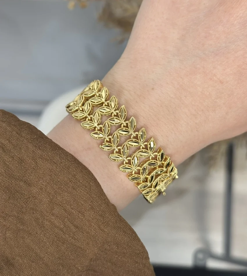 Asil "Çift Sıra Başak" örgüsünün gösterişli duruşu, "Oluklu Ajda" bileziklerin zarif ışıltısıyla bu lüks sette bir araya geldi! Bileğinizde anında zengin ve dolgun bir "stack" (istif) görünümü yaratır.