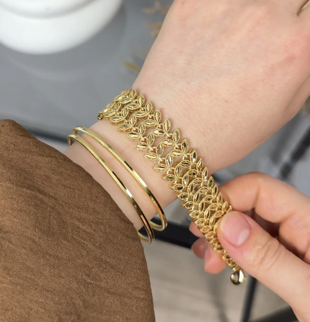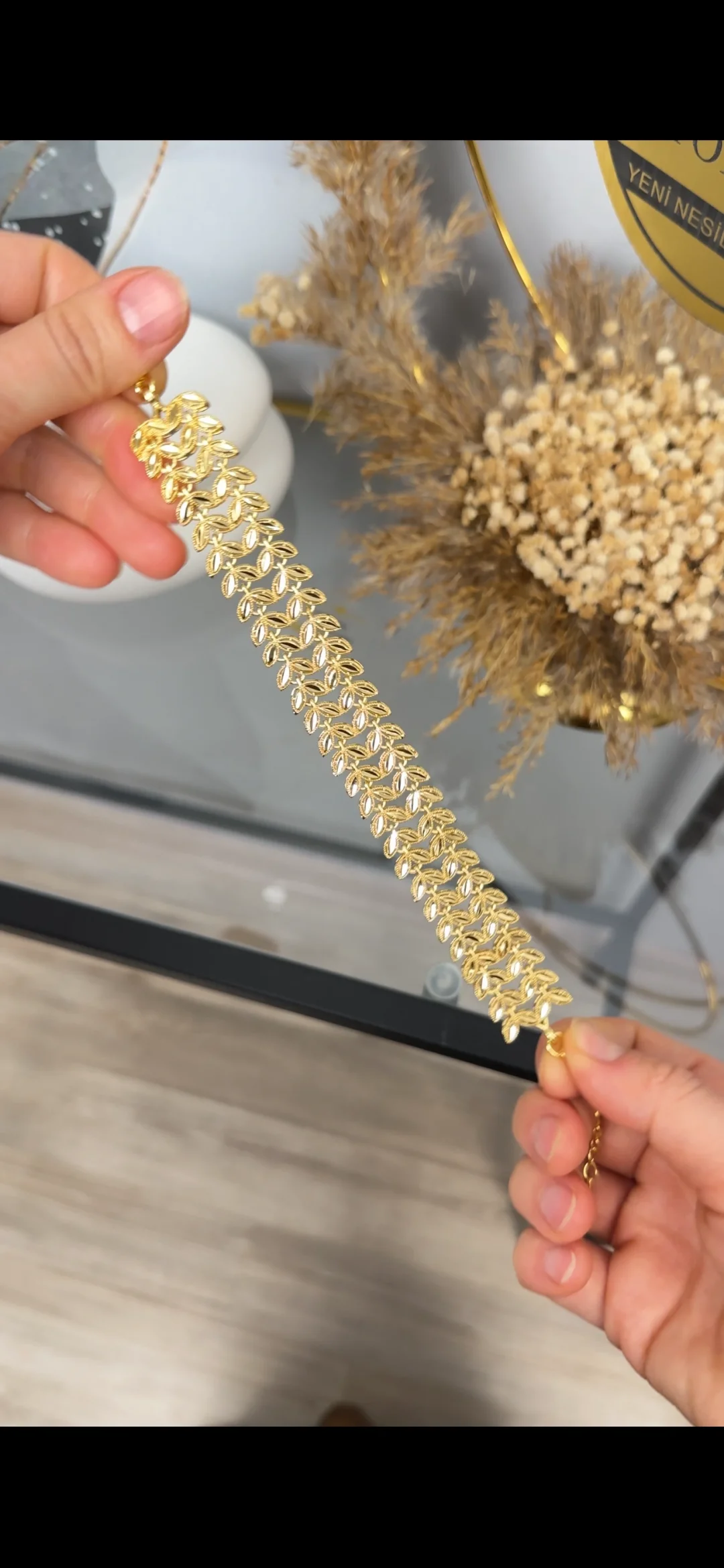 Mükemmel uyum, hazır set! ✨ Bu 3 parçalık şık kombin, 1 adet gösterişli "Çift Sıra Başak Bileklik" ve 2 adet zarif "Oluklu Ajda Bilezik" içerir. Hepsi birebir kuyumcu modeli, 22 ayar altın kaplamadır ve Nikel içermez (Anti-Alerjiktir).