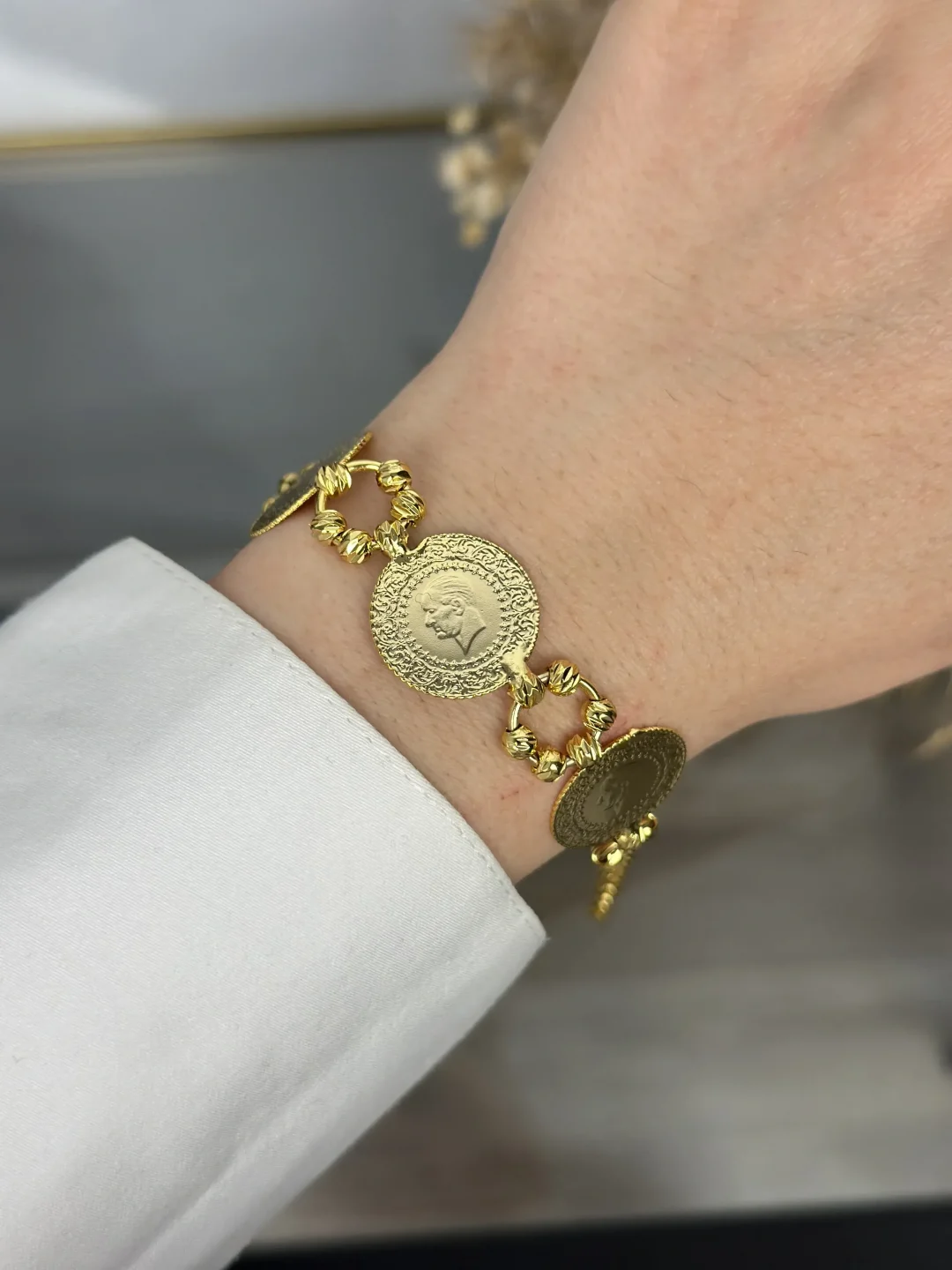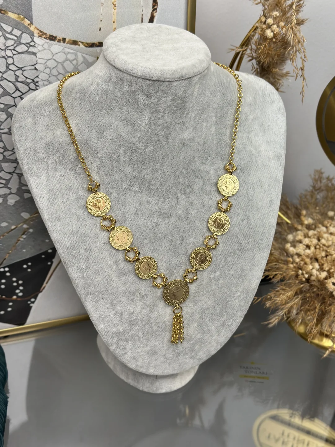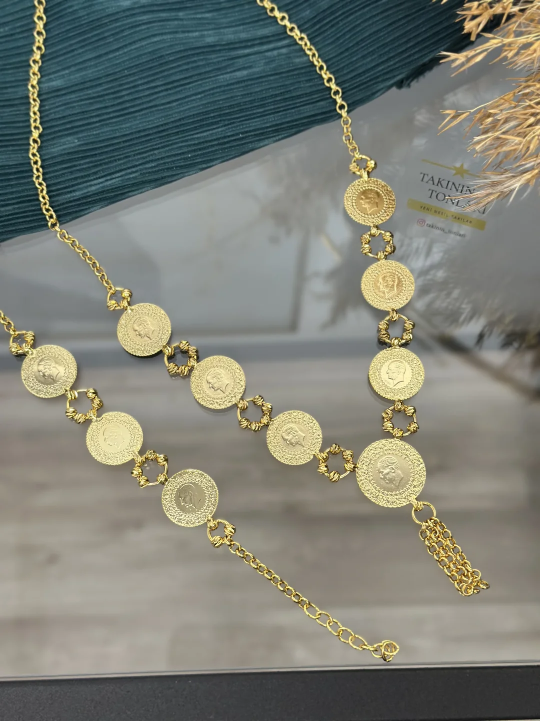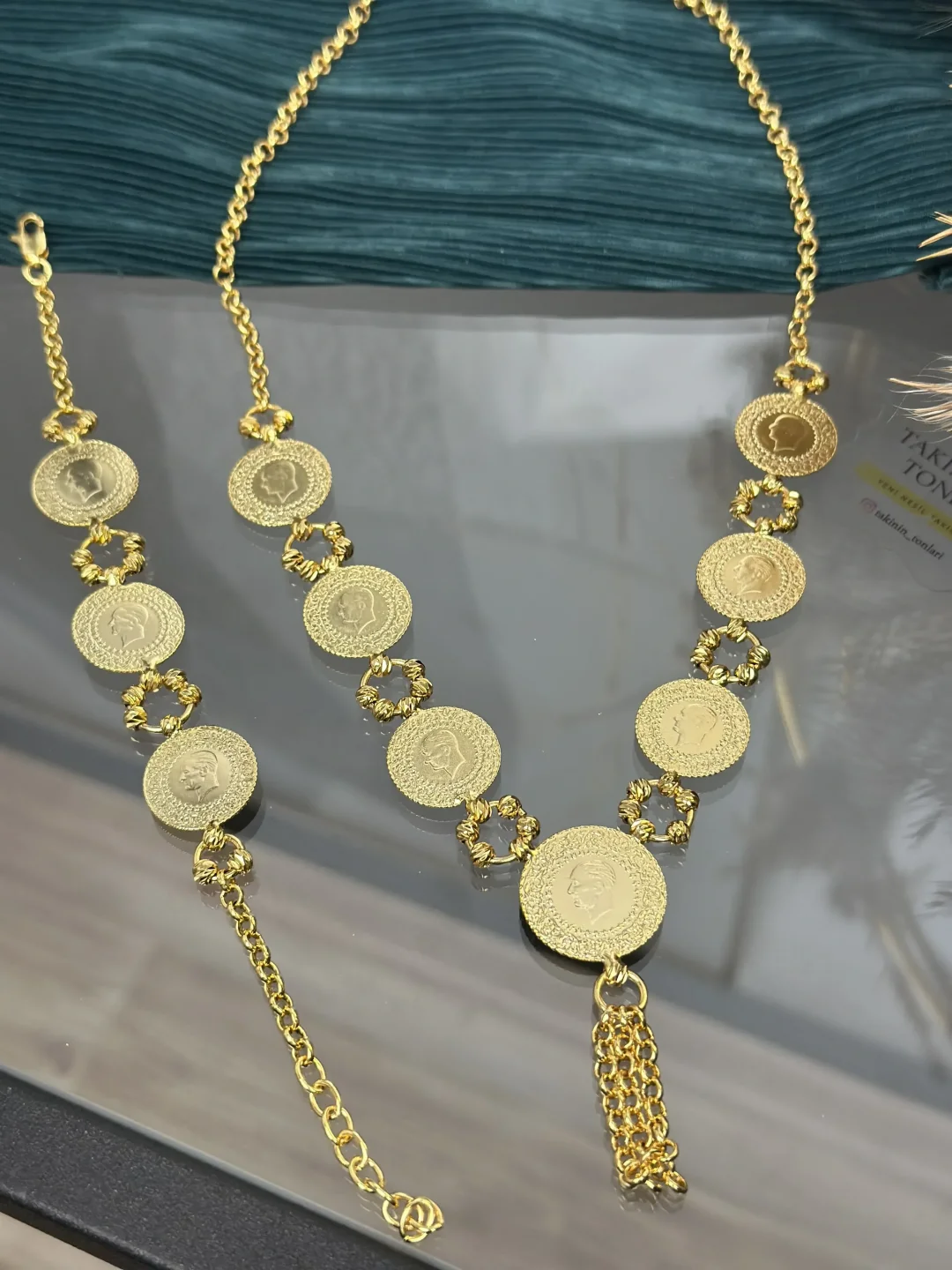 Mükemmel uyumlu lüks set! ✨ Bu tam set, 1 adet "Dorikalı Gerdanlık Kolye" (ortası Yarım, yanları Çeyrek görünümlü) ve 1 adet "3 Çeyrekli Dorikalı Bileklik" içerir. Birebir kuyumcu modeli, 22 ayar altın kaplamadır, Nikel içermez (Anti-Alerjiktir) ve ayarlanabilir boydadır.