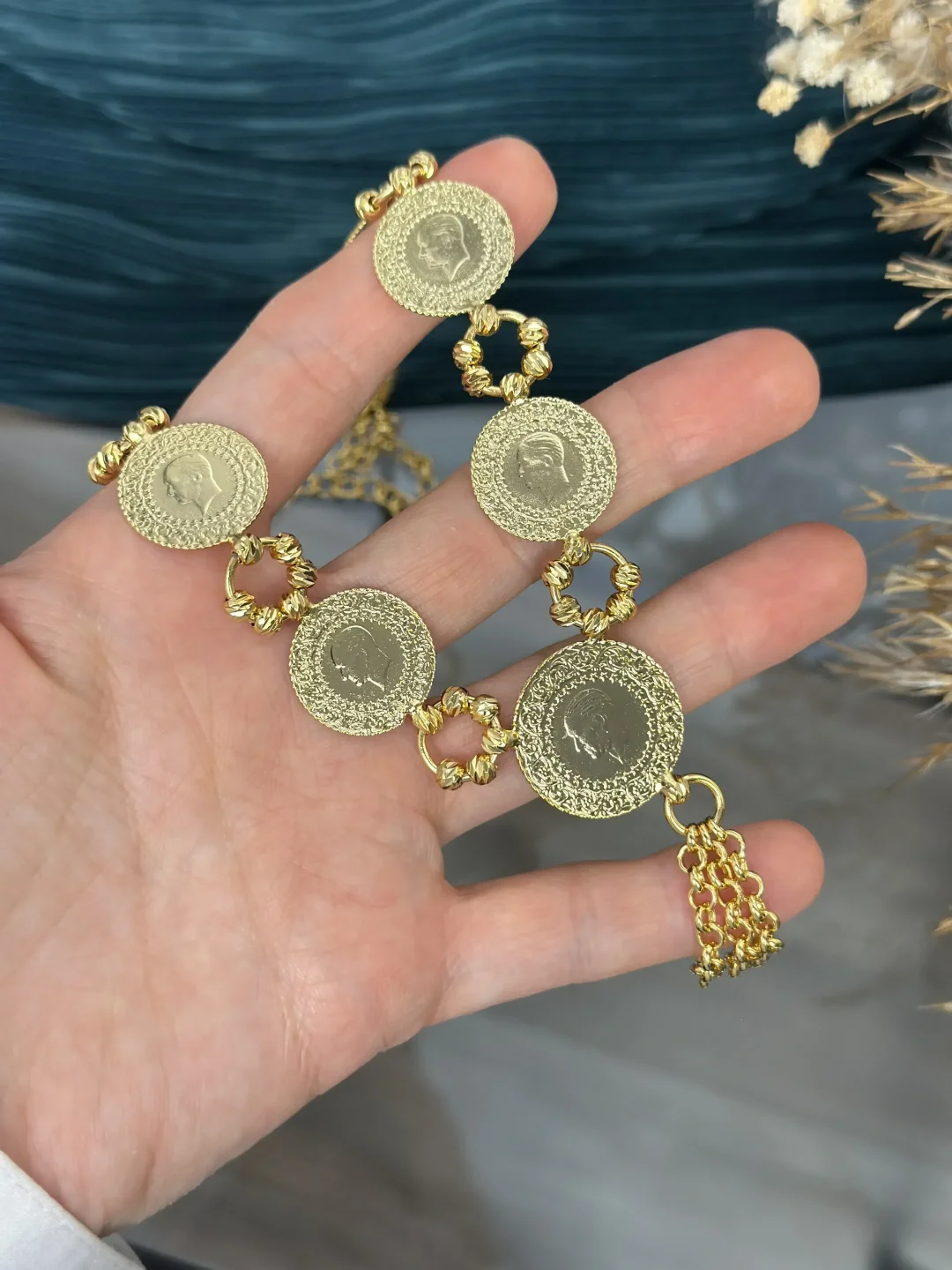 Birebir kuyumcu modeli! ✨ Bu gösterişli "7'li Set", 1 adet "Yarım Altın Görünümlü" ve 6 adet "Çeyrek Altın Görünümlü" imitasyon uç ile tam bir kombin olarak gelir. Zinciri ışıltılı "Dorika" toplarıyla süslenmiştir ve ayarlanabilir boydadır. 22 ayar altın kaplamadır. (Uçlar gerçek altın değildir).
