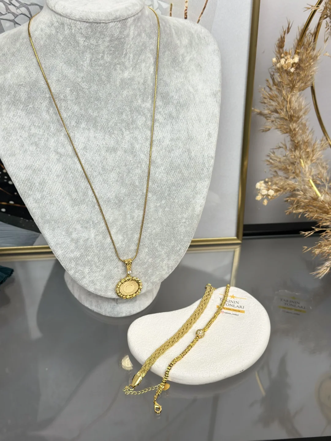 Bu setteki "Çeyrek Altın Görünümlü" parça bir aksesuar/bijuteri ürünüdür. Gerçek altın DEĞİLDİR. Maddi bir altın değeri TAŞIMAZ.