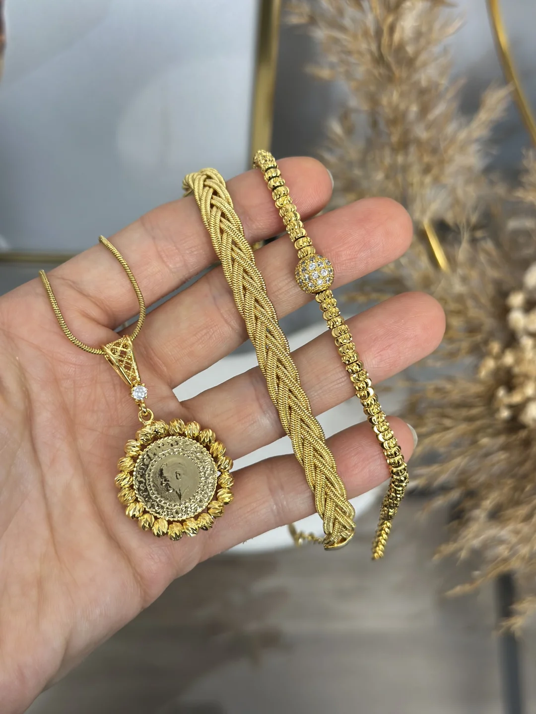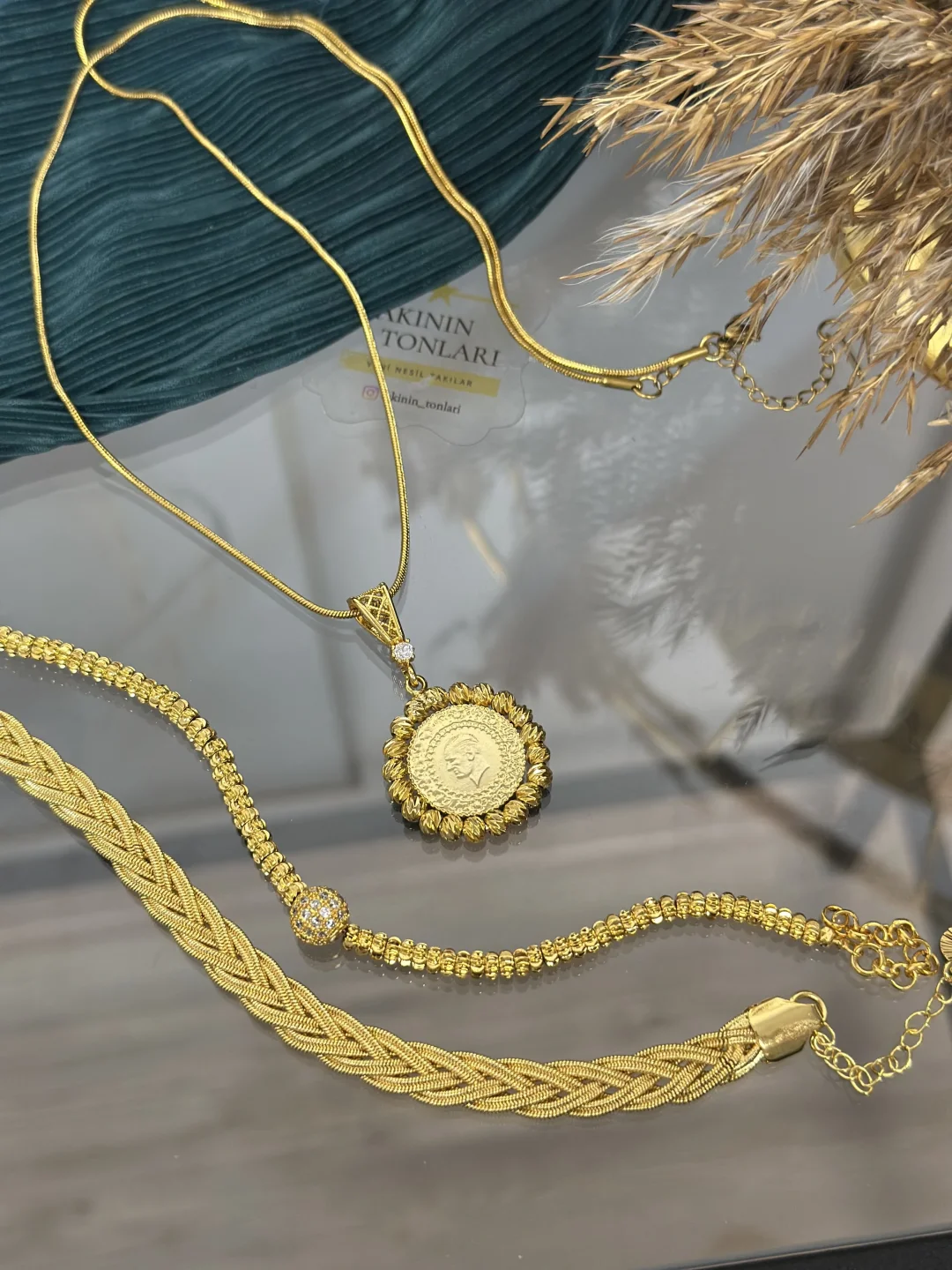 Mükemmel uyum, hazır set! ✨ Bu 4 parçalık lüks kombin, 1 adet Çelik Ezme Kolye (60+5 cm), 1 adet Dorikalı Çeyrek Kolye Ucu (Muadil), 1 adet Taşlı Dorika Bileklik ve 1 adet Örgü Bileklik içerir. Dayanıklı çelik ve 22 ayar kuyumcu modeli kaplama parçaları bu sette bir aradadır. (Çeyrek uç gerçek altın değildir).