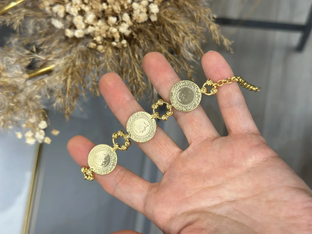 Birebir kuyumcu modeli! ✨ Bu gösterişli bileklik, 3 adet sabit "Çeyrek Görünümlü" detaya ve ışıltılı "Dorika" toplarına sahiptir. 22 ayar altın kaplamadır, Nikel içermez (Anti-Alerjiktir) ve ayarlanabilir (17+4 cm) yapıdadır. Zengin ve ışıltılı bir stil sunar.