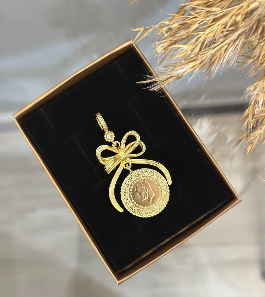 Kolyedeki "Çeyrek Altın Görünümlü" parça bir aksesuar/bijuteri ürünüdür. Gerçek altın DEĞİLDİR. Maddi bir altın değeri TAŞIMAZ.