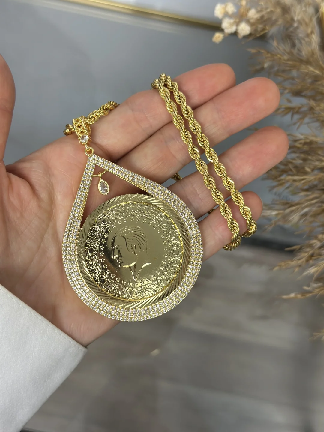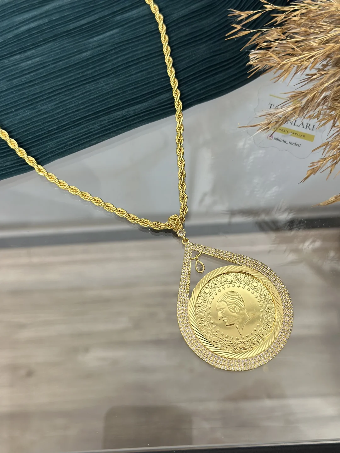 Etrafını saran zirkon taşlı zarif "Damla" çerçeve, kolyeye modern bir pırıltı katarken; 4 mm kalınlığındaki halat örgü zincir, gerçek altının ağırlığını ve dokusunu birebir hissettirir. Özellikle kalın zincir seven ve takısının uzaktan bile fark edilmesini isteyenler için kusursuz bir tercihtir.