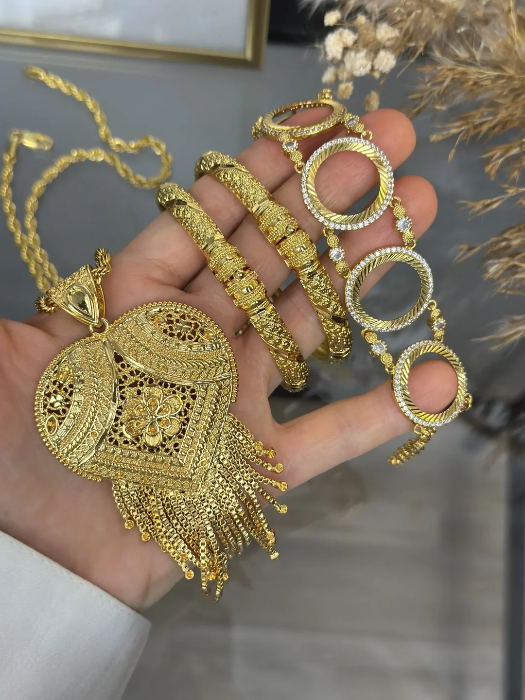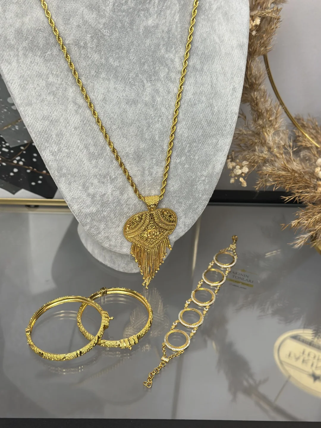 Bu set, tam 5 adet premium üründen (2 Kelepçe, 1 Kolye Ucu, 1 Zincir, 1 Bileklik) oluşur ve birebir kuyumcu modelinde, 1. sınıf işçilikle, 22 ayar altın kaplama ile üretilmiştir.