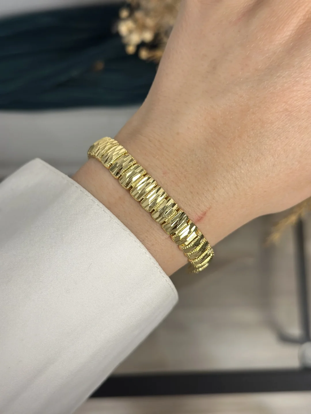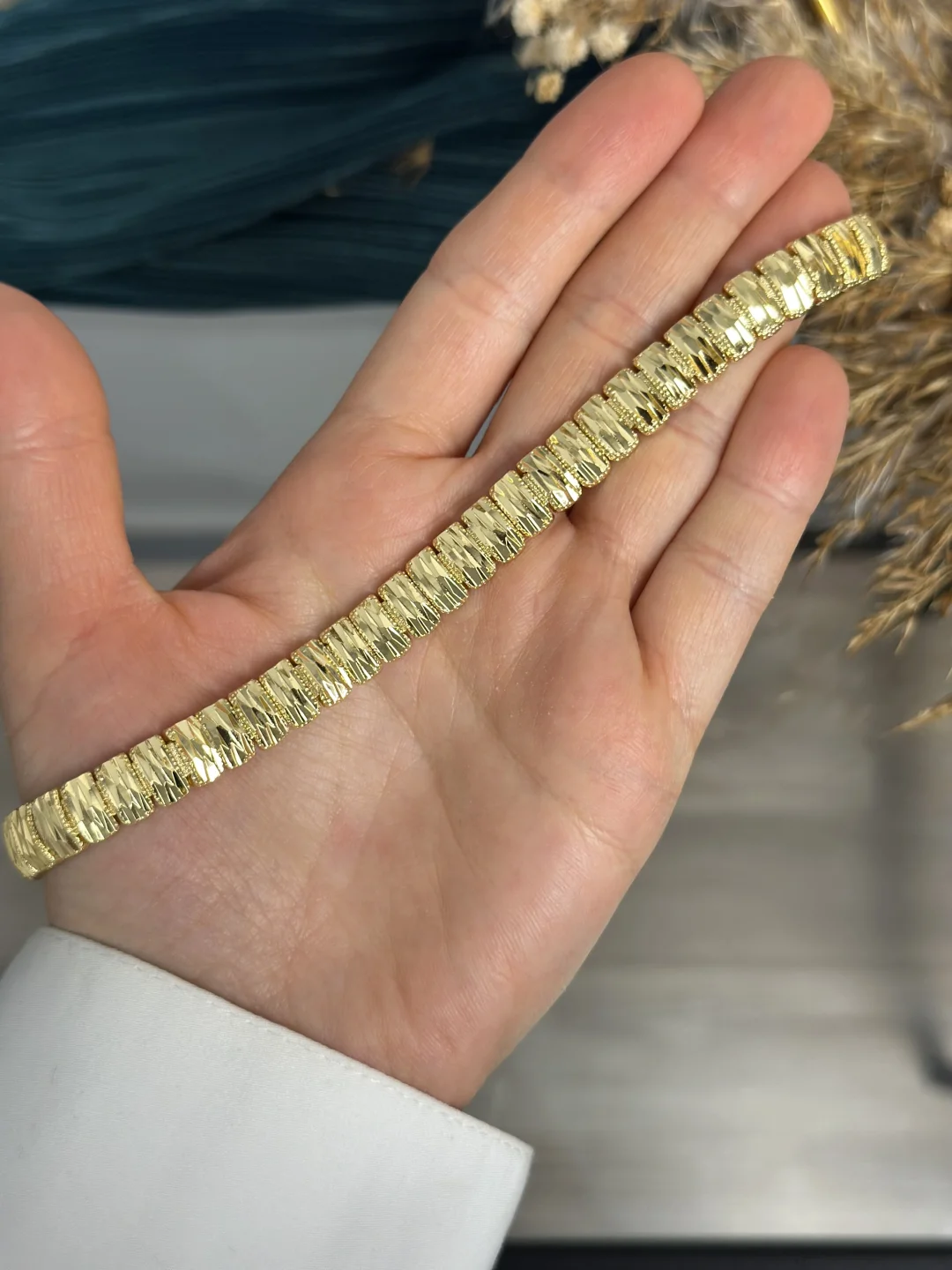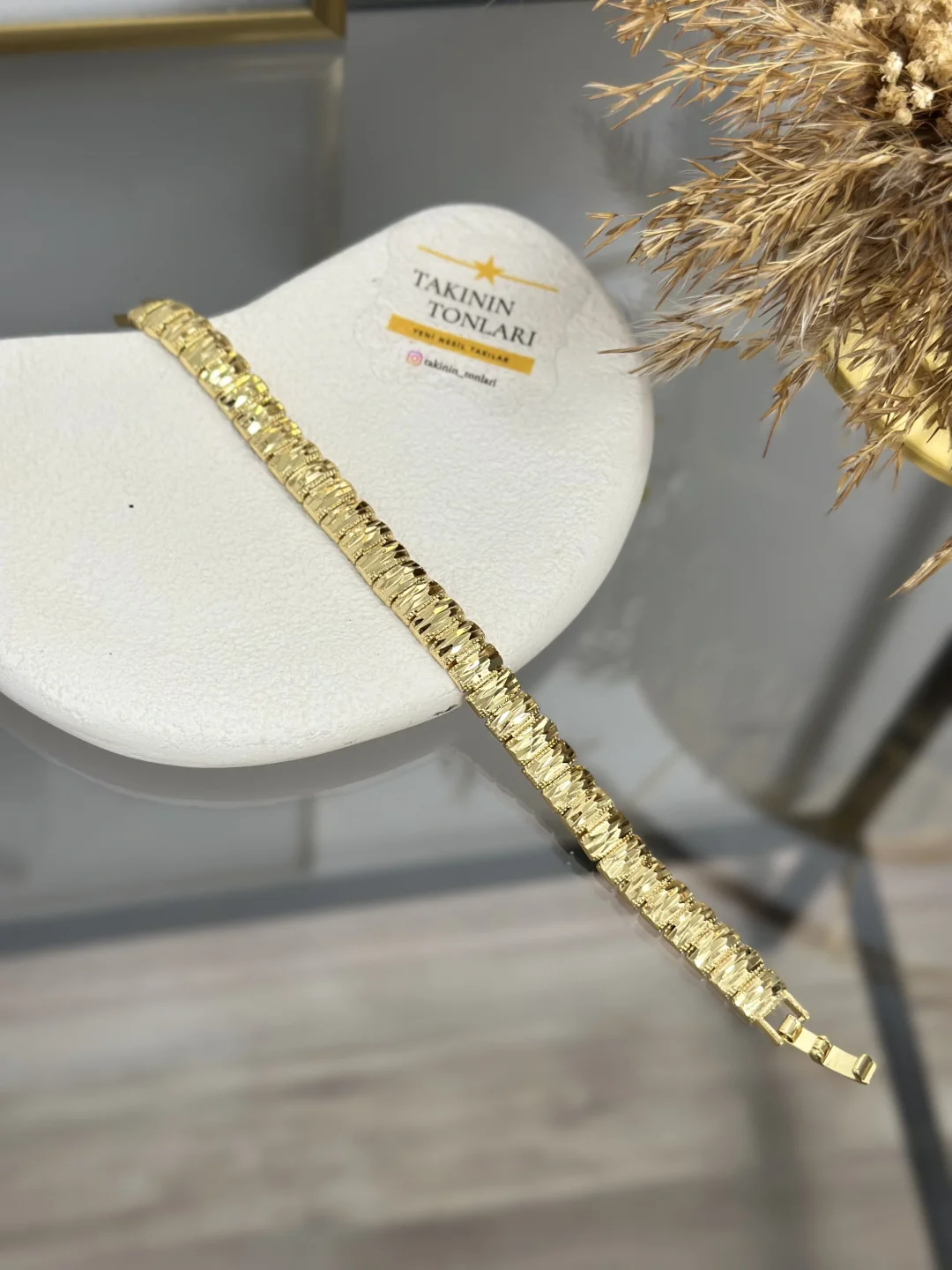 Bilekliği oluşturan sıralı dikdörtgen baklaların üzerine uygulanan özel "Kalem İşi" (elmas kesim) tekniği, bileziğe her açıdan ışığı yansıtan, pırıl pırıl bir parlaklık katar. Bu model, birebir kuyumcu modelinde, 1. sınıf işçilikle ve 22 ayar altın kaplama ile üretilmiştir.