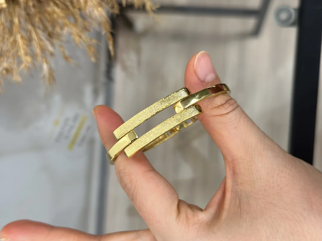 Sade ama iddialı, modern ama bir o kadar da asil... "Kaburga" modelinin sevilen tok duruşu, 22 ayar altının en özel işçiliklerinden biri olan "Kumlu" dokuyla bu kelepçede buluştu.