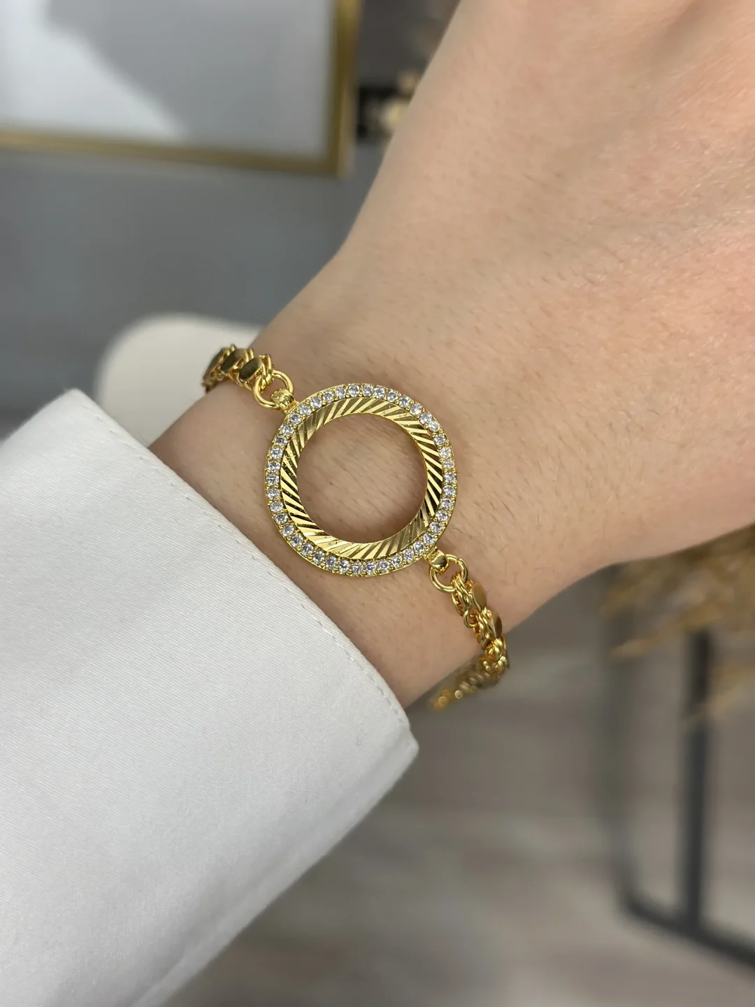 "Arpa" zincirin asil duruşu, "Çeyrek Altın" çerçevesini çevreleyen zarif tek sıra ışıltılı zirkon taşlarla buluştu. Bu bileklik, stilinizi kişiselleştirmeniz için size iki harika seçenek sunar!