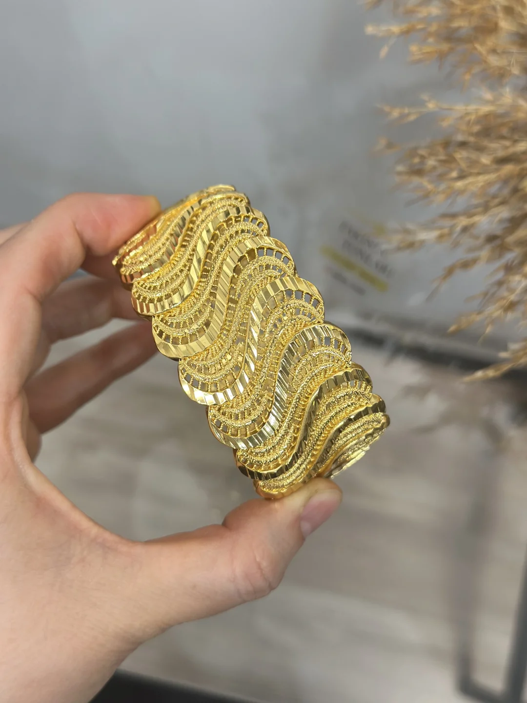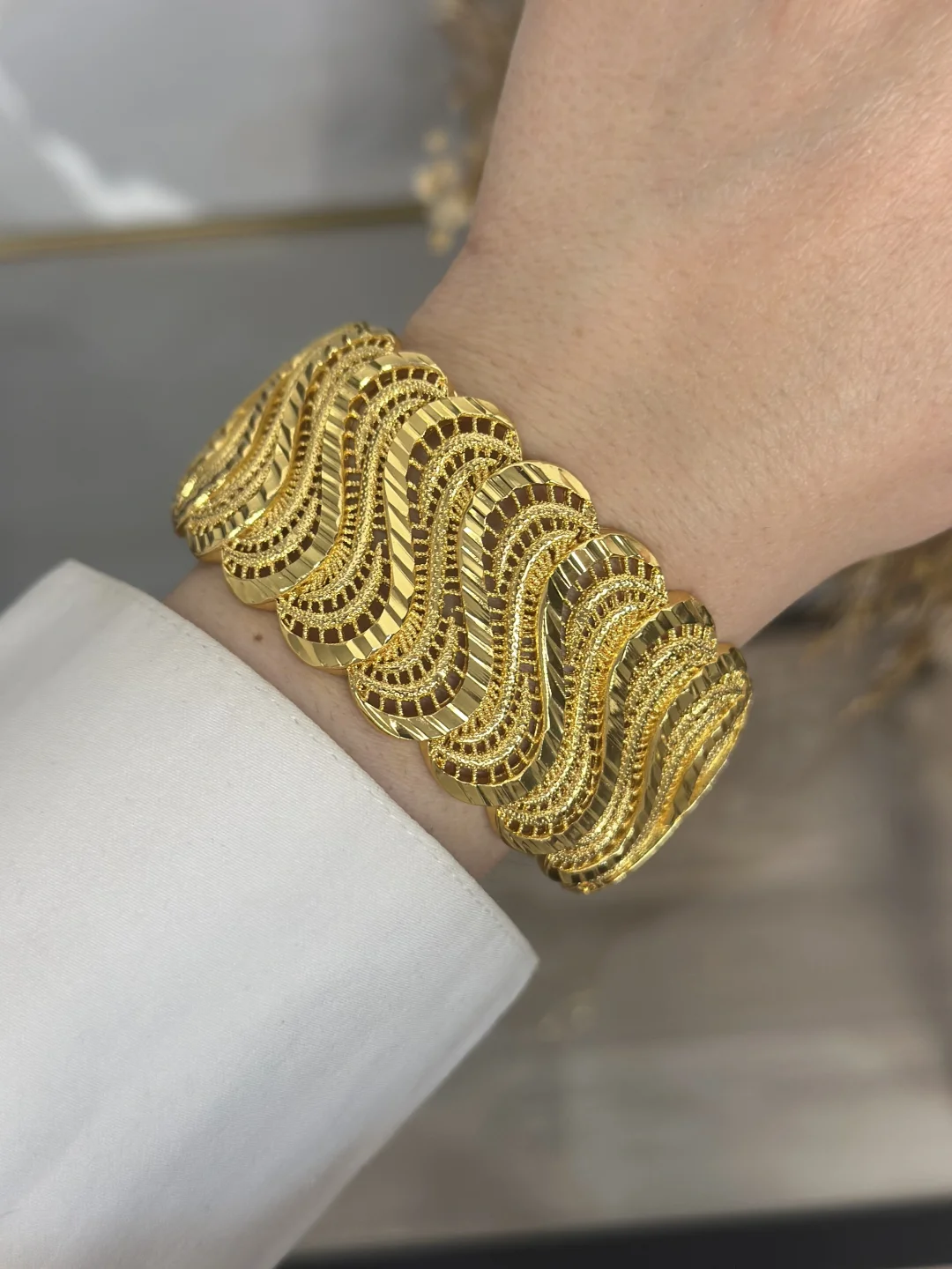 Birebir kuyumcu modeli! 22 Ayar altın kaplama bu geniş kelepçe, geleneksel "Telkari" sanatının modern dalgalı formla buluştuğu eşsiz bir tasarıma sahiptir. 20 cm uzunluğuyla bilekte dolgun ve zengin bir duruş sergiler. Kararmaya karşı özel cilalıdır ve Nikel içermez (Anti-Alerjiktir). Düğün ve özel davetler için kusursuz bir seçimdir.