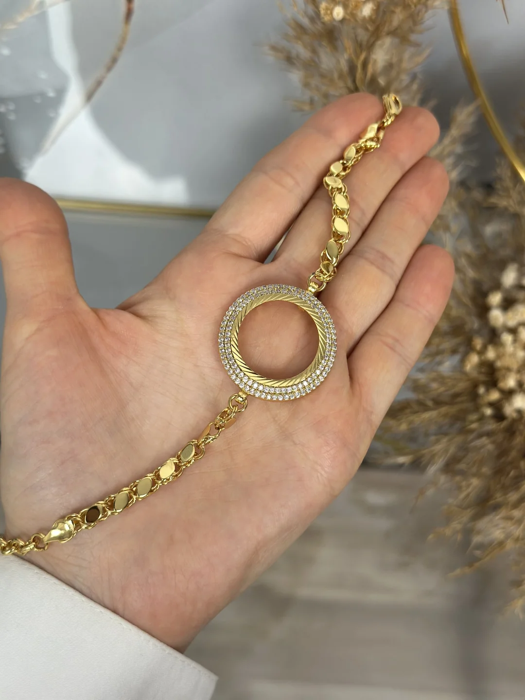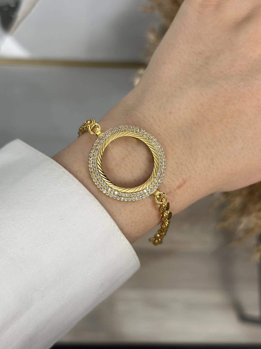 "Arpa" zincirin asil duruşu, "Yarım Altın" çerçevesini çevreleyen göz alıcı çift sıra ışıltılı zirkon taşlarla buluştu. Bu bileklik, stilinizi kişiselleştirmeniz için size iki harika seçenek sunar!