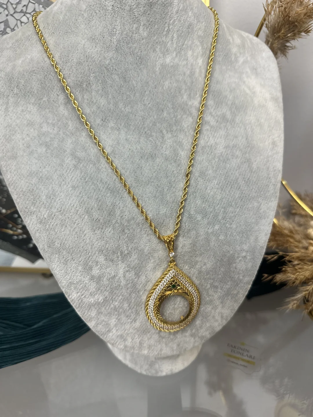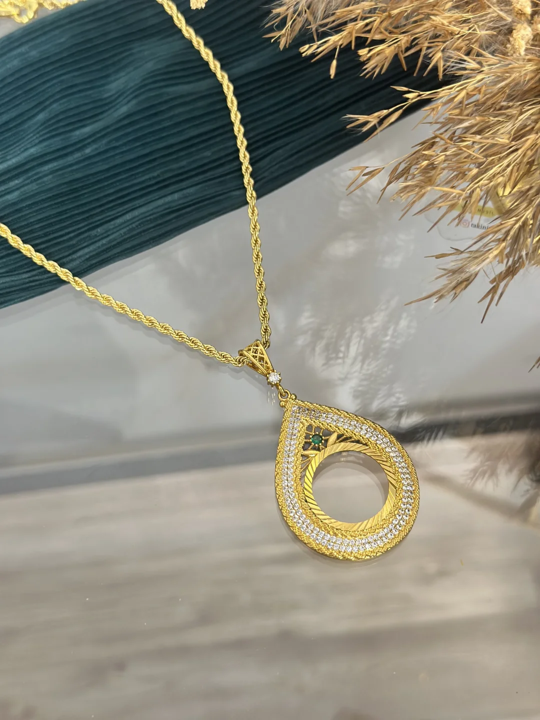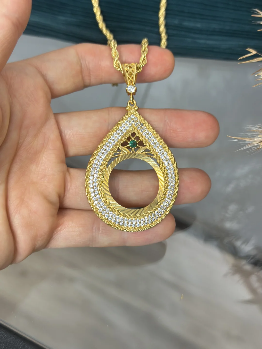 Geleneksel Şıklık: 22 Ayar Yeşil Taşlı Damla Çerçeve Yarım Altınlık Kolye ✨