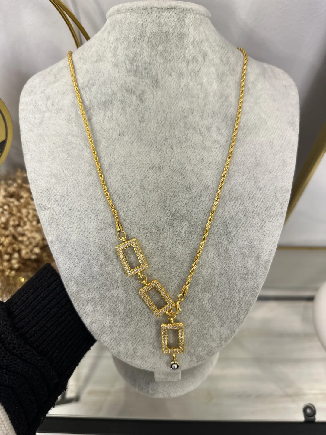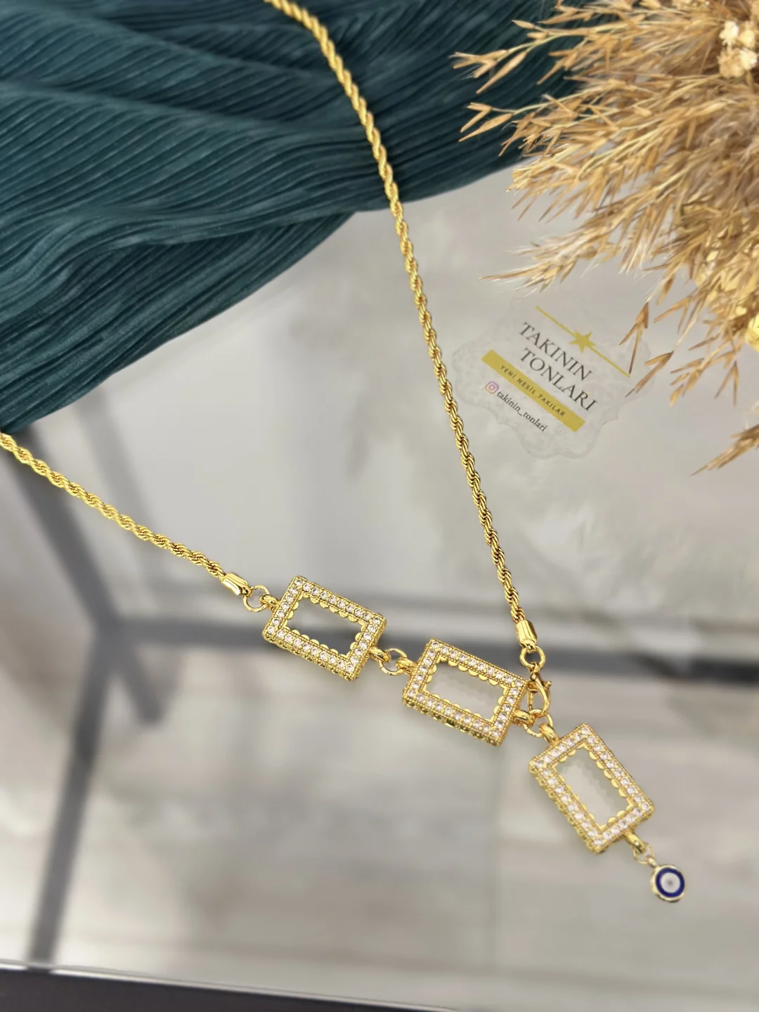 Bu iddialı model, kuyumculuğun en sağlam ve klasik zinciri olan Burgu (Halat) Zincir ile başlar ve göğüs hizasında şık bir "Y" formu alarak aşağıya doğru süzülür. Kolyenin "kuyruk" kısmında, alt alta sıralanmış 3 adet taşlı çerçeve bulunur. Bu çerçevelere 3 tane dikdörtgen 1 gram altınınızı yerleştirerek, boynunuzda mini bir servet taşırsınız.