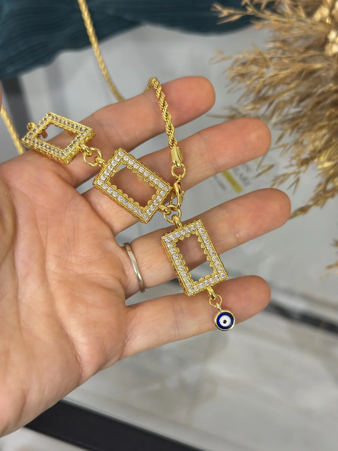 Tasarımın en ucuna eklenen Mavi Nazar Boncuğu, bu kadar göz alıcı bir takıyı kem gözlerden sakınmak için zarif bir dokunuş yapar. Özellikle düğünlerde, altın günlerinde veya özel davetlerde tüm dikkatleri üzerinize çekecek "Ağa/Hanımağa" modelidir.
