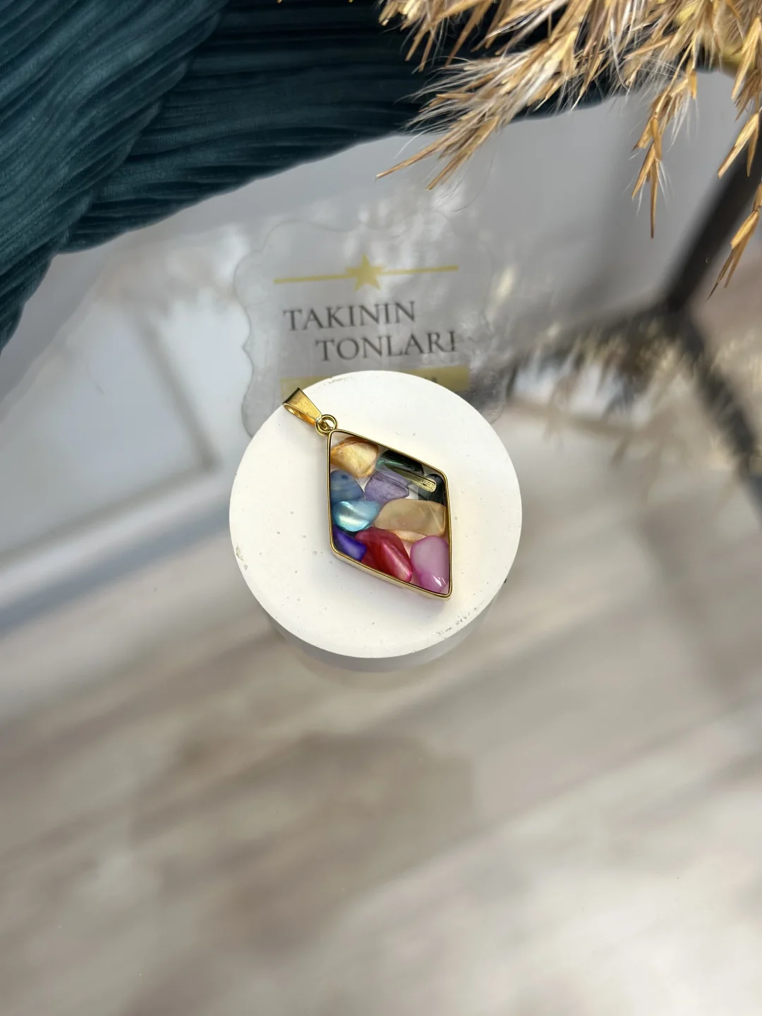 Not: Her bir kolye ucu el yapımı olup, içindeki taş parçacıklarının dağılımı, yoğunluğu ve deseni nedeniyle benzersizdir ve fotoğraftakinden küçük farklılıklar gösterebilir.