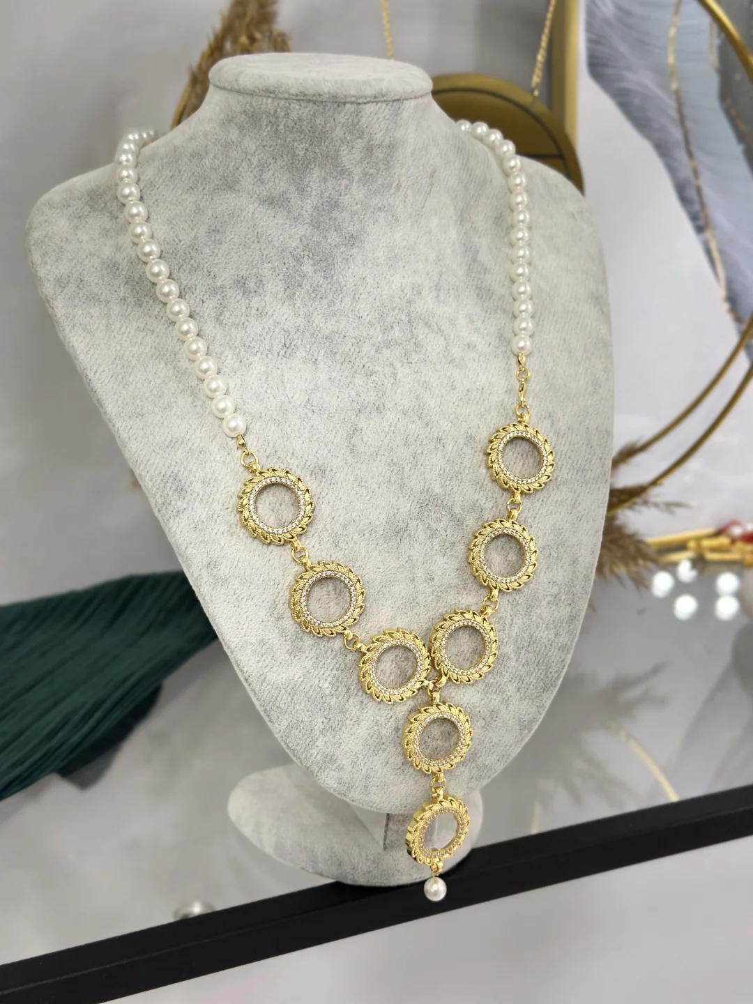 Kolyenin bir tarafı, asaleti temsil eden Sıralı İncilerden, diğer tarafı ise ışıltılı gold zincirden oluşur. Bu iki farklı doku, boynunuzda muazzam bir dengeyle buluşur ve aşağıya doğru süzülen 8 Adet Taşlı Çerçeve ile son bulur.