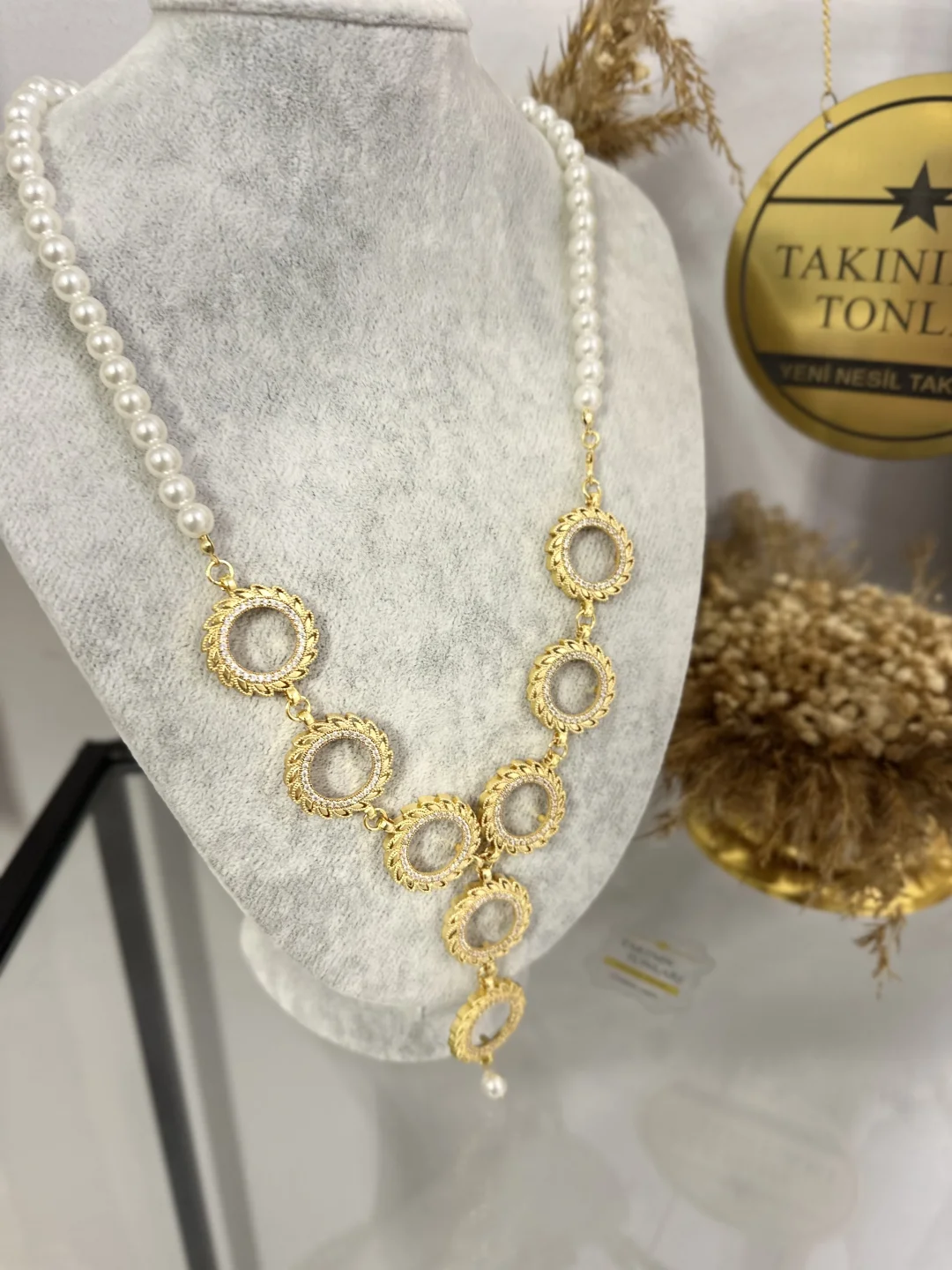 8'li İnci Kolye: Modern asimetrik tasarımıyla dikkat çeker; bir tarafı zarafet timsali incilerden, diğer tarafı ışıltılı zincirden oluşur. Aşağıya doğru süzülen 8 adet taşlı çerçeveye çeyrek altınlarınızı yerleştirdiğinizde boynunuzda bir şelale görüntüsü oluşur.