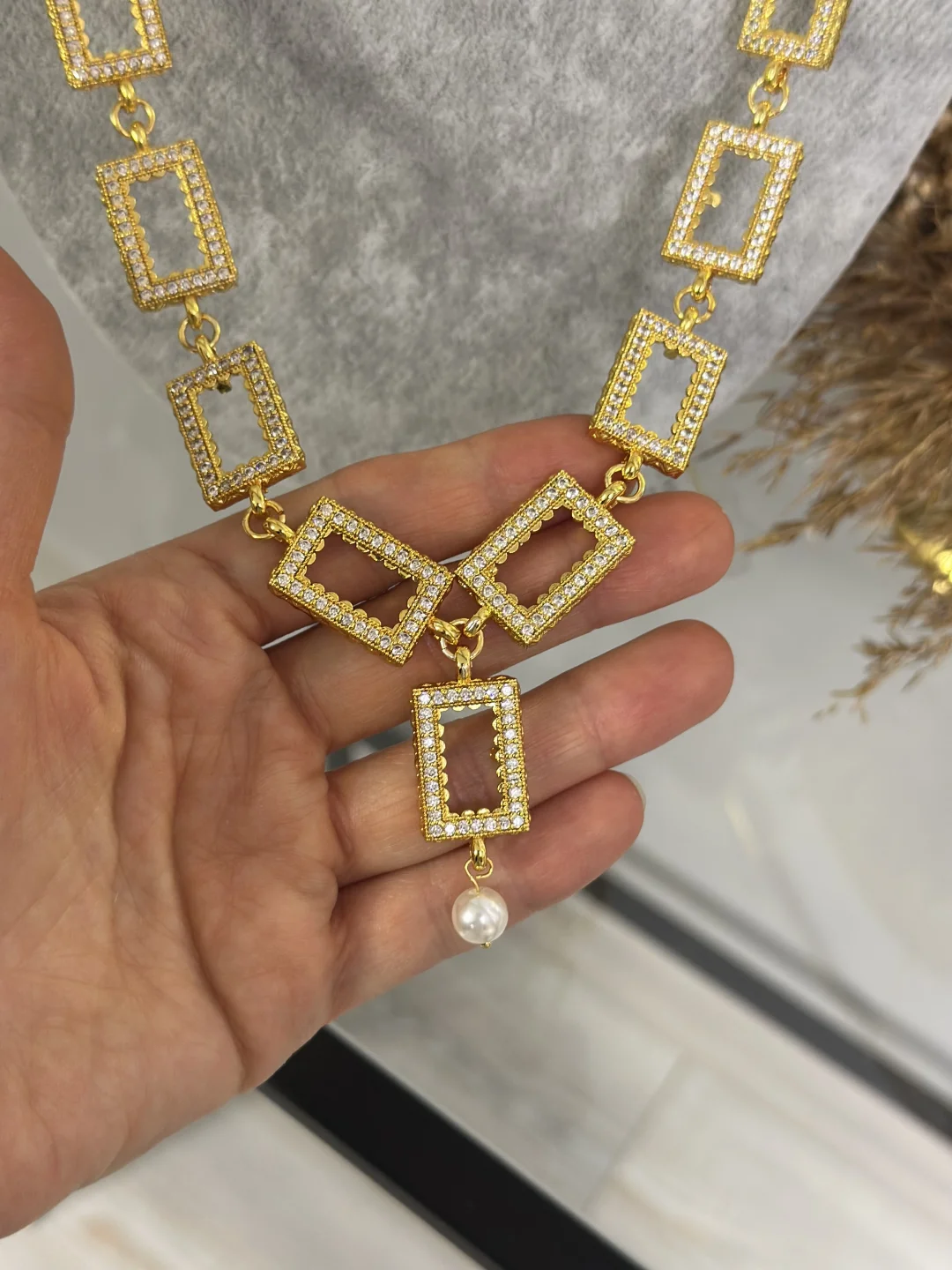 Görenleri büyüleyen ihtişam! Tam 9 Adet 1 Gramlık (Dikdörtgen) külçe altın kapasiteli, İnci Zincir detaylı özel tasarım gerdanlık. Altının gücünü incinin zarafetiyle buluşturan, taşlı çerçeveleri ve sallantılı inci ucuyla düğün ve nişanların en gözde parçası.