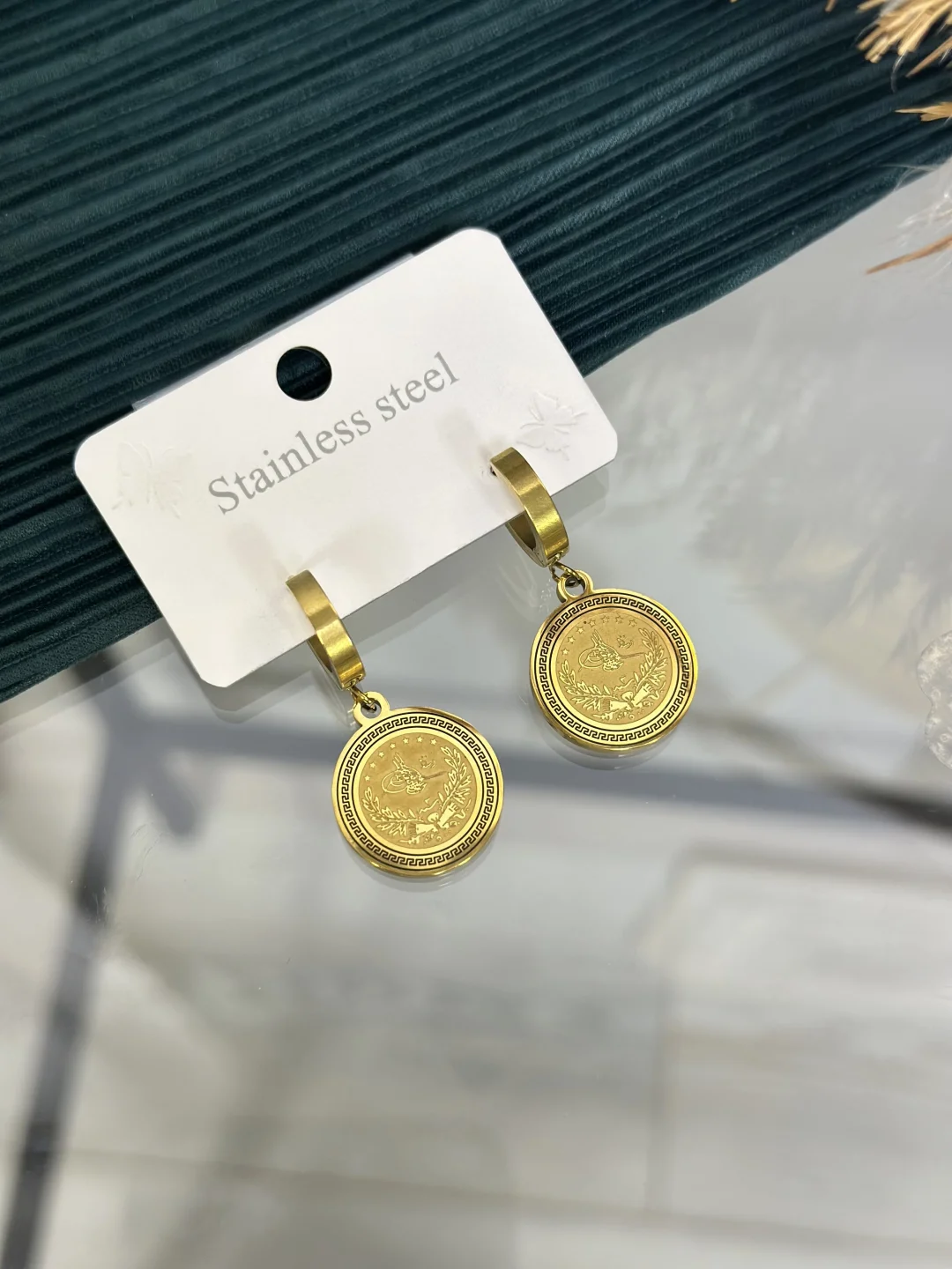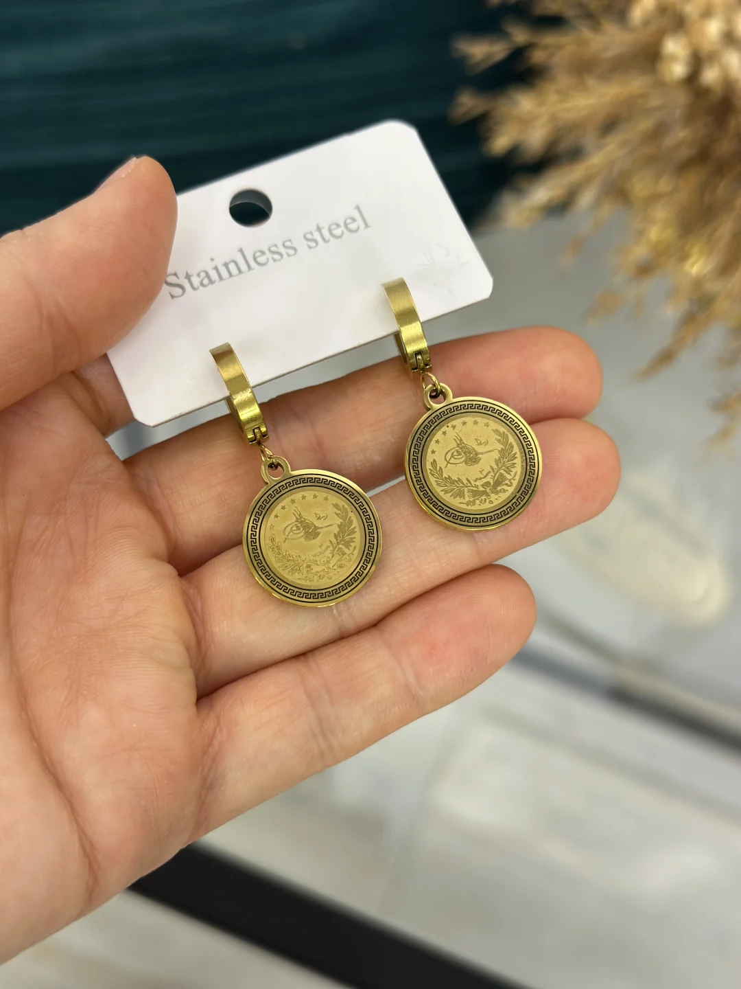 Tarihin ihtişamı, çeliğin dayanıklılığıyla buluştu! 316L Paslanmaz Çelikten üretilen, Gold renkli Osmanlı Tuğrası motifli sallantılı halka küpe. Suya, denize ve duşa dayanıklı yapısı, kararmayan kalitesi ve asil tuğra detayıyla hem geleneksel hem modern tarzın vazgeçilmezi.