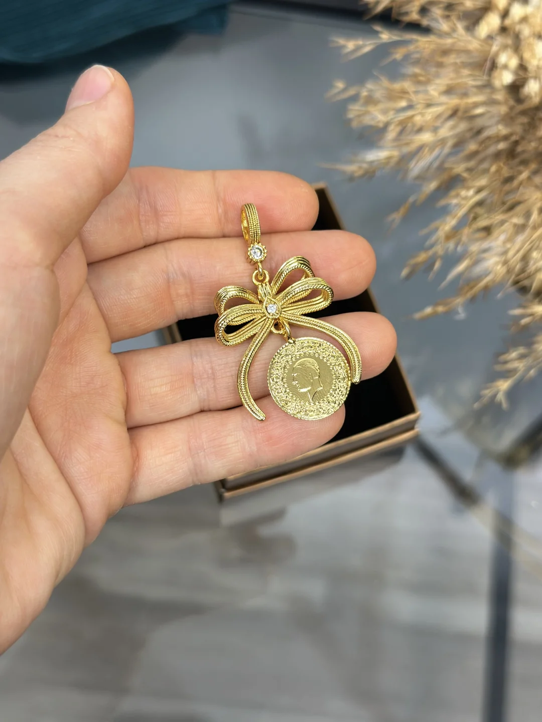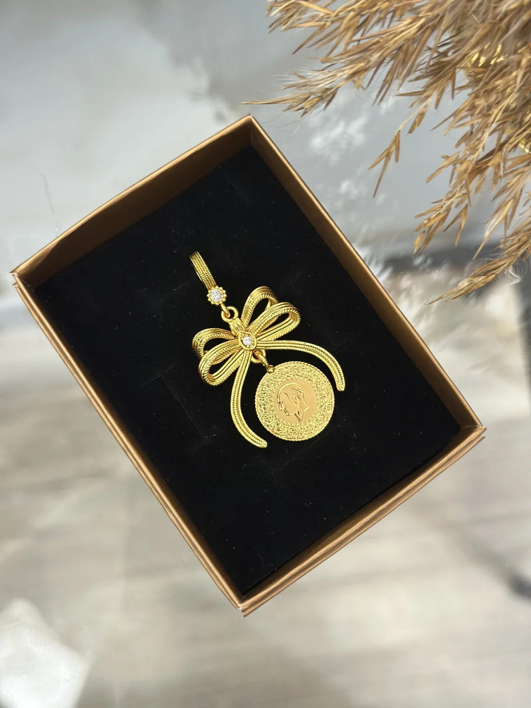 Zinciriniz şıklık kazansın! Mevcut zincirlerinize kolayca takabileceğiniz, taşlı fiyonk tasarımlı ve ucunda birebir uyumlu İmitasyon Çeyrek Altın bulunan özel kolye ucu. Düğünlerin vazgeçilmezi çeyrek altın görüntüsünü, zarif bir fiyonk detayıyla birleştiren ekonomik ve gösterişli aksesuar.