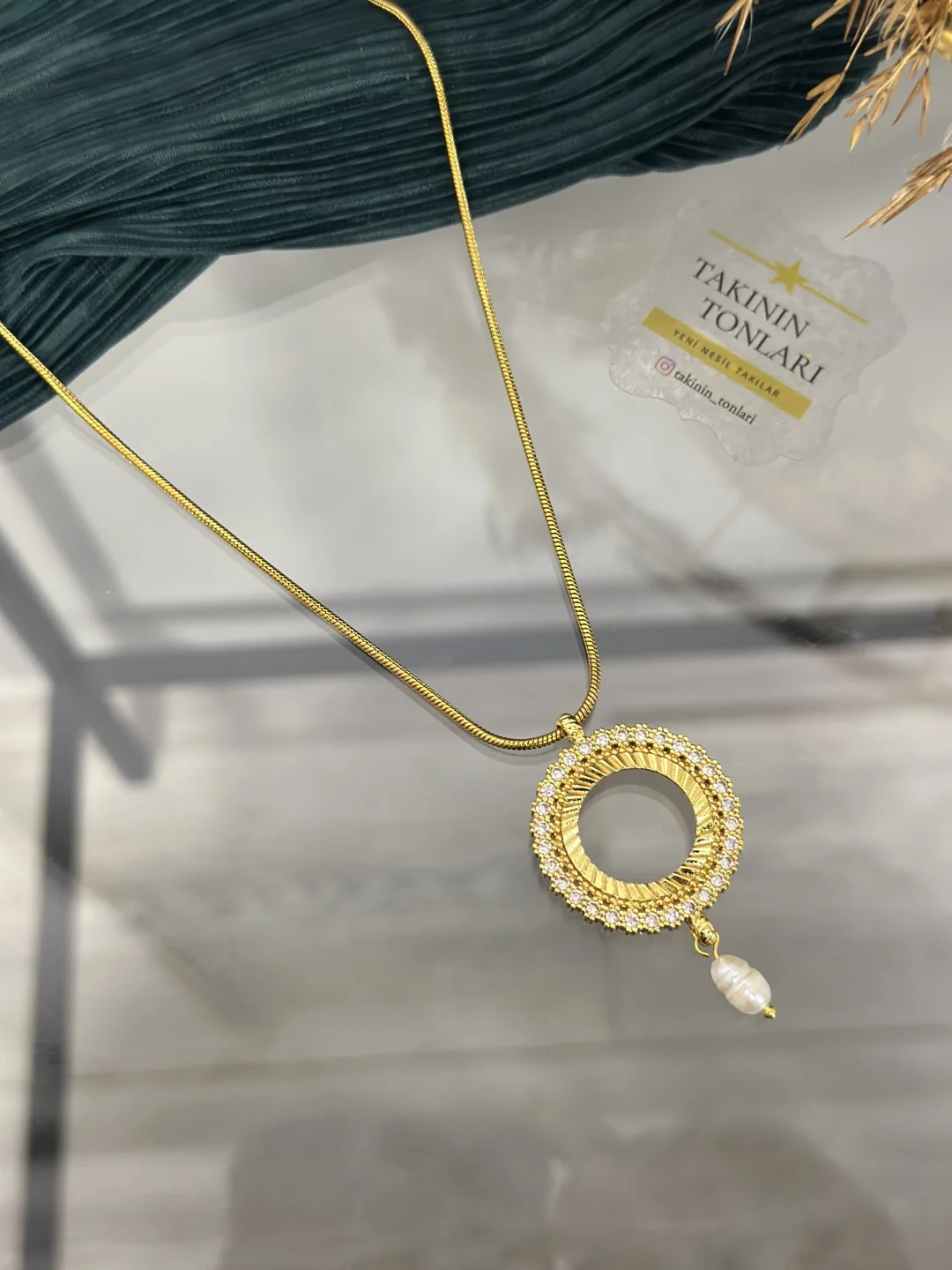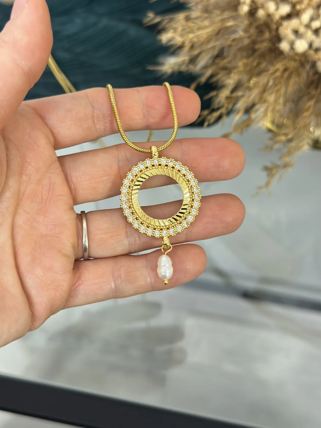Doğal İnci Dokunuşu: Çerçevenin altında sallanan Gerçek Doğal İnci, altının ışıltısını yumuşatarak kolyeye "Vintage" ve asil bir hava katar.