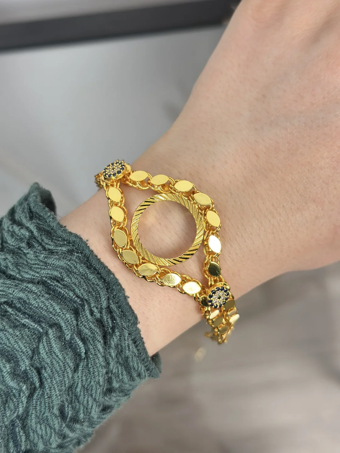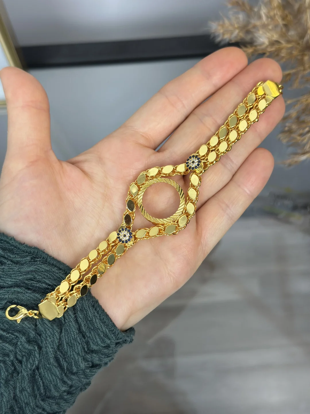 Bileğinizde çifte ışıltı, çifte koruma! Kendi çeyrek altınınızı takabileceğiniz, Çift Sıra Arpa Zincir örgülü ve Nazar Boncuğu detaylı gold bileklik. 16+3 cm ayarlanabilir uzunluğuyla bileği saran, kalın ve dolgun yapısıyla 22 ayar altın bilezikleri aratmayan lüks boş montür.