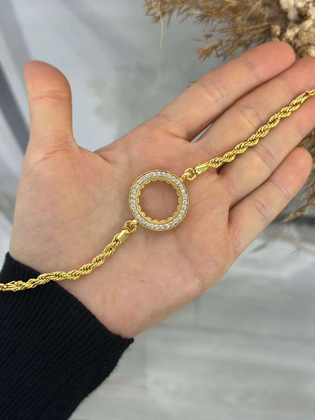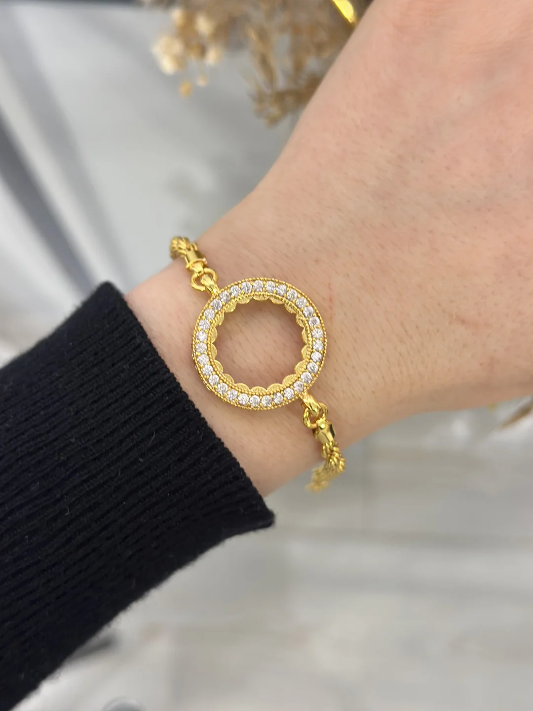 Bileğinizde kesintisiz ışıltı! Kendi çeyrek altınınızı takabileceğiniz, etrafı tek sıra pırlanta ışıltılı zirkon taşlarla çevrili gold bileklik. Dayanıklı Burgu (Buğday) Zincir yapısı ve zarif Sıra Taşlı çerçevesiyle, hem modern hem de klasik tarzı birleştiren 22 ayar altın kaplama boş montür.