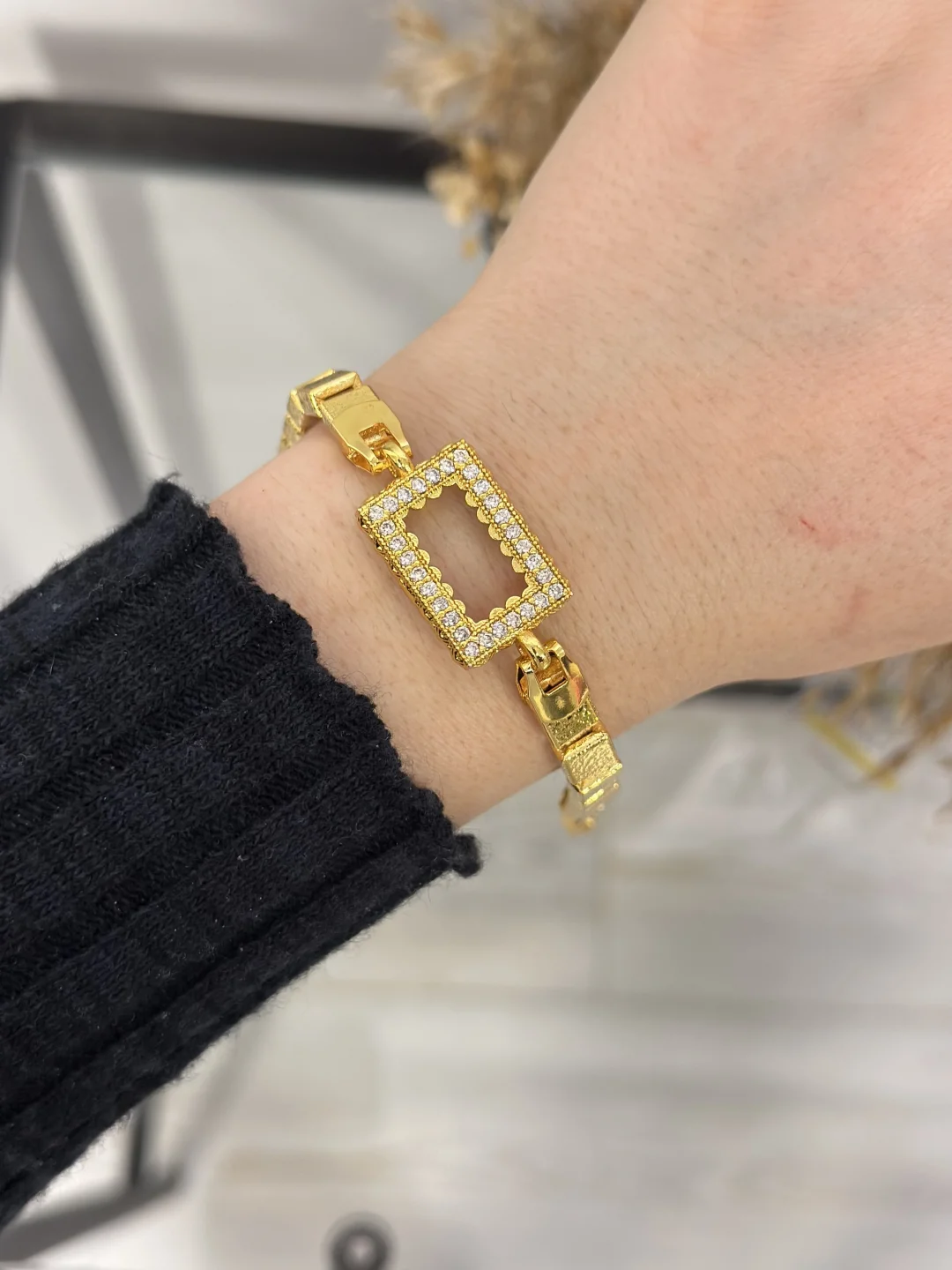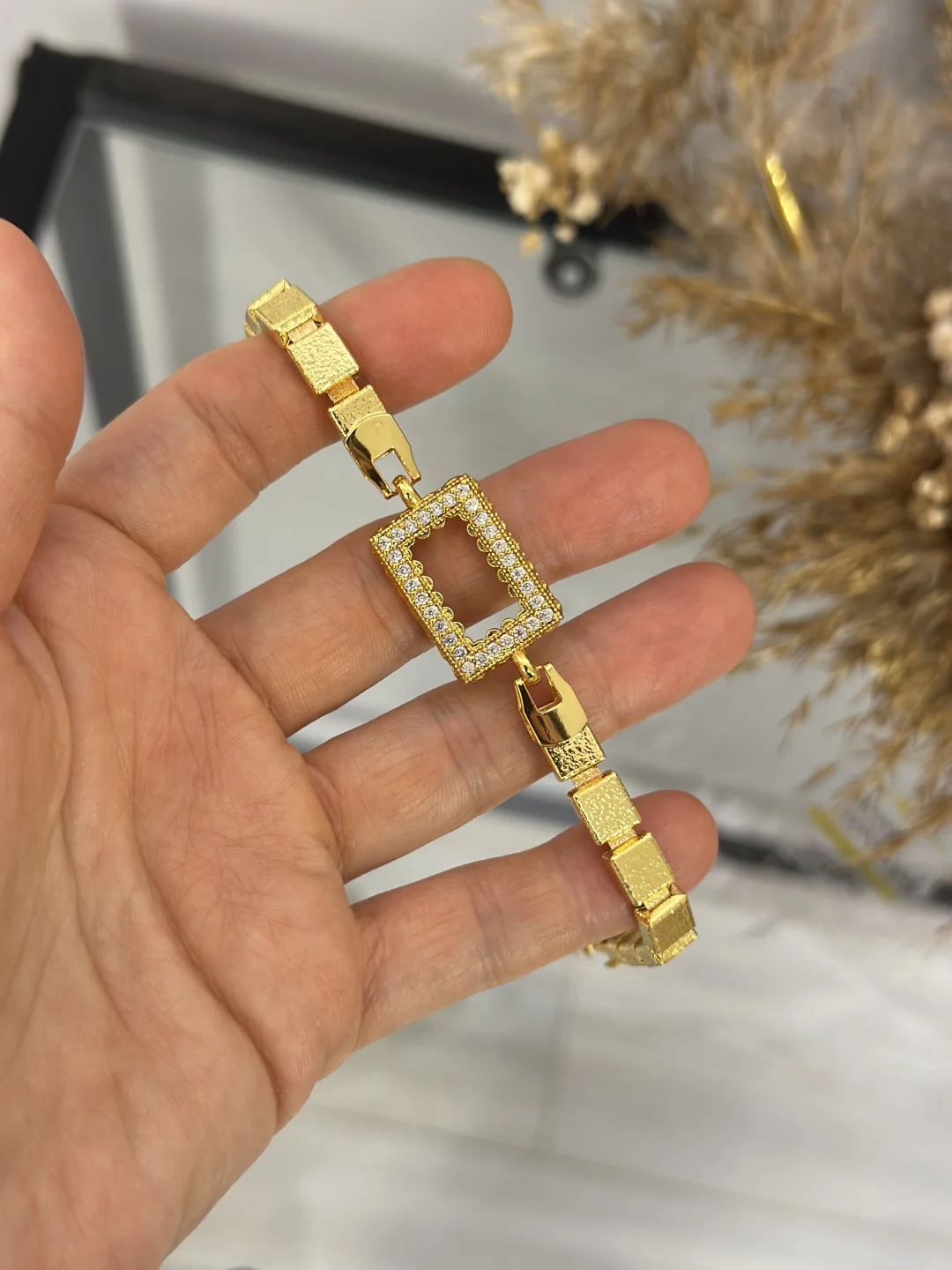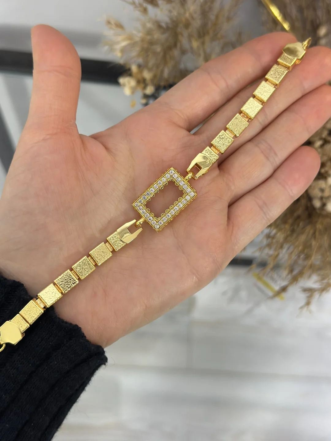 Bileğinizde adeta modern bir mimari eser gibi duran bu zincir, merkezindeki zirkon taşlı dikdörtgen çerçeve ile birleşerek 1 gramlık altınınızı (birikiminizi) şık bir takıya dönüştürür. Hem spor hem de klasik kıyafetlerle uyum sağlayan, "Tok ve Kaliteli" bir parçadır.