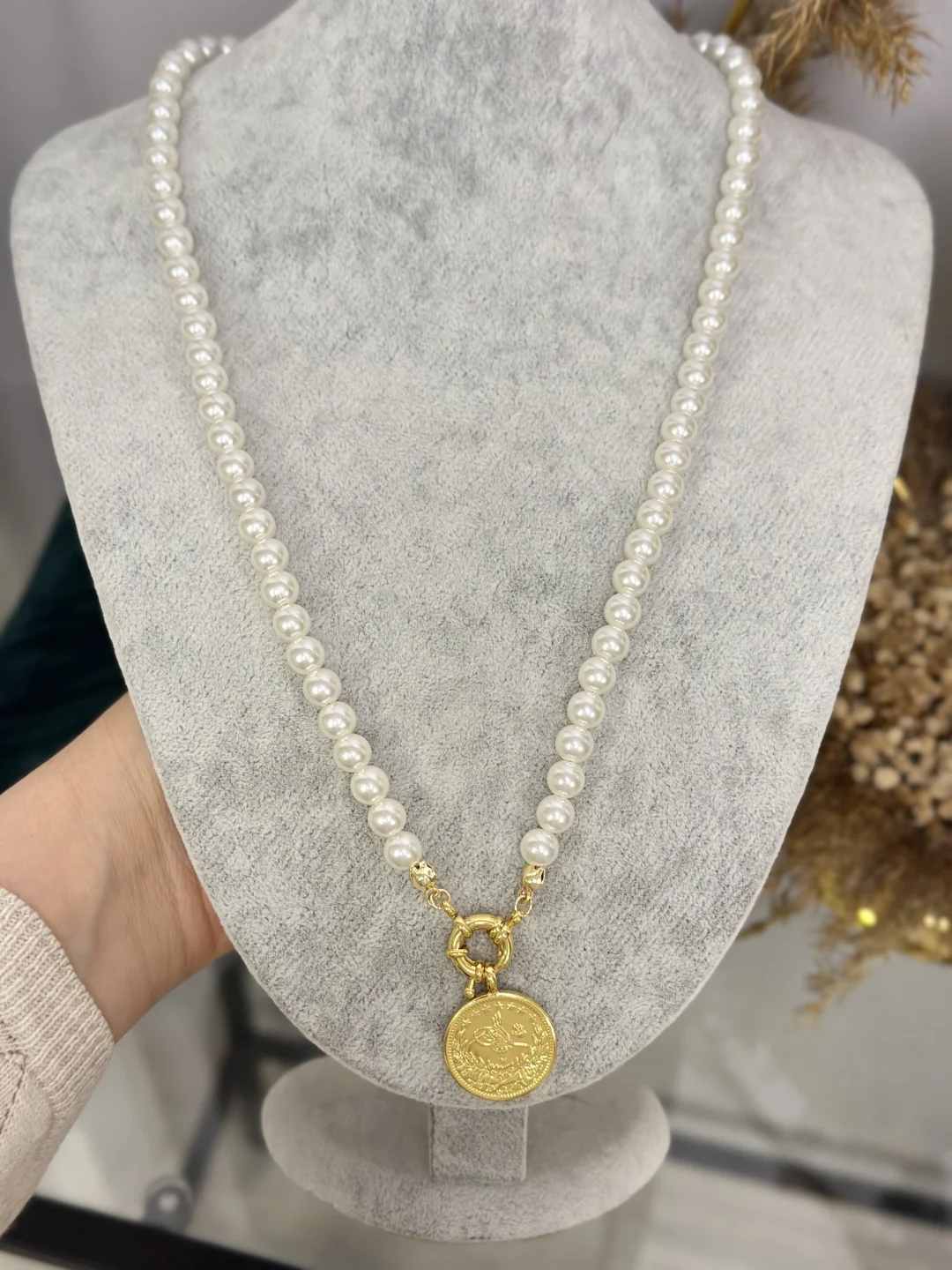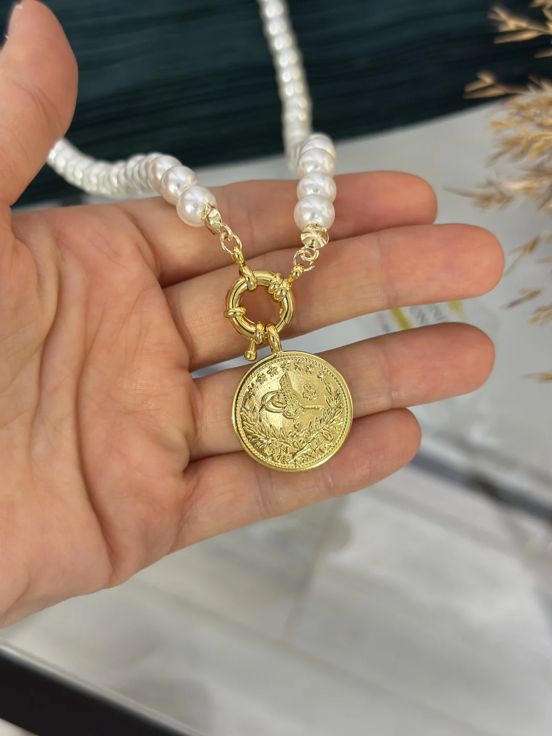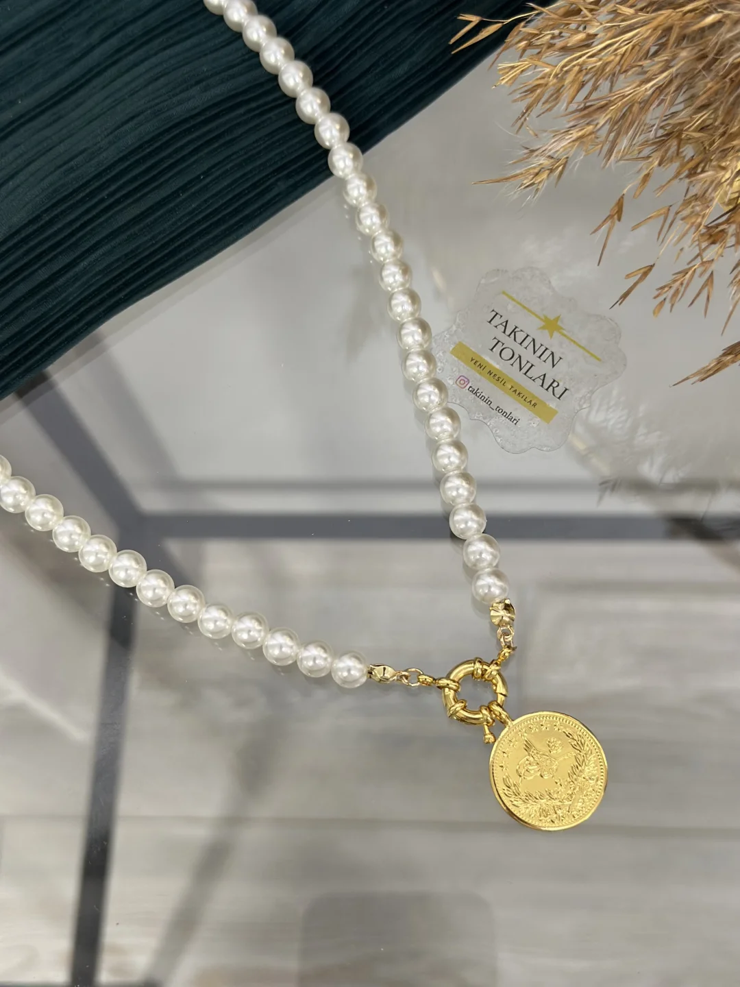 İncilerin asareti, Reşat altının ihtişamıyla buluştu! 60 cm uzunluğunda, özel Dümen Kilit (Gemici) tasarımlı ve ucunda birebir uyumlu İmitasyon 2.5'luk Reşat Altın bulunan inci kolye. Hem günlük şıklığınızı hem de özel gün kombinlerinizi taçlandıracak, Osmanlı esintili modern bir tasarım.