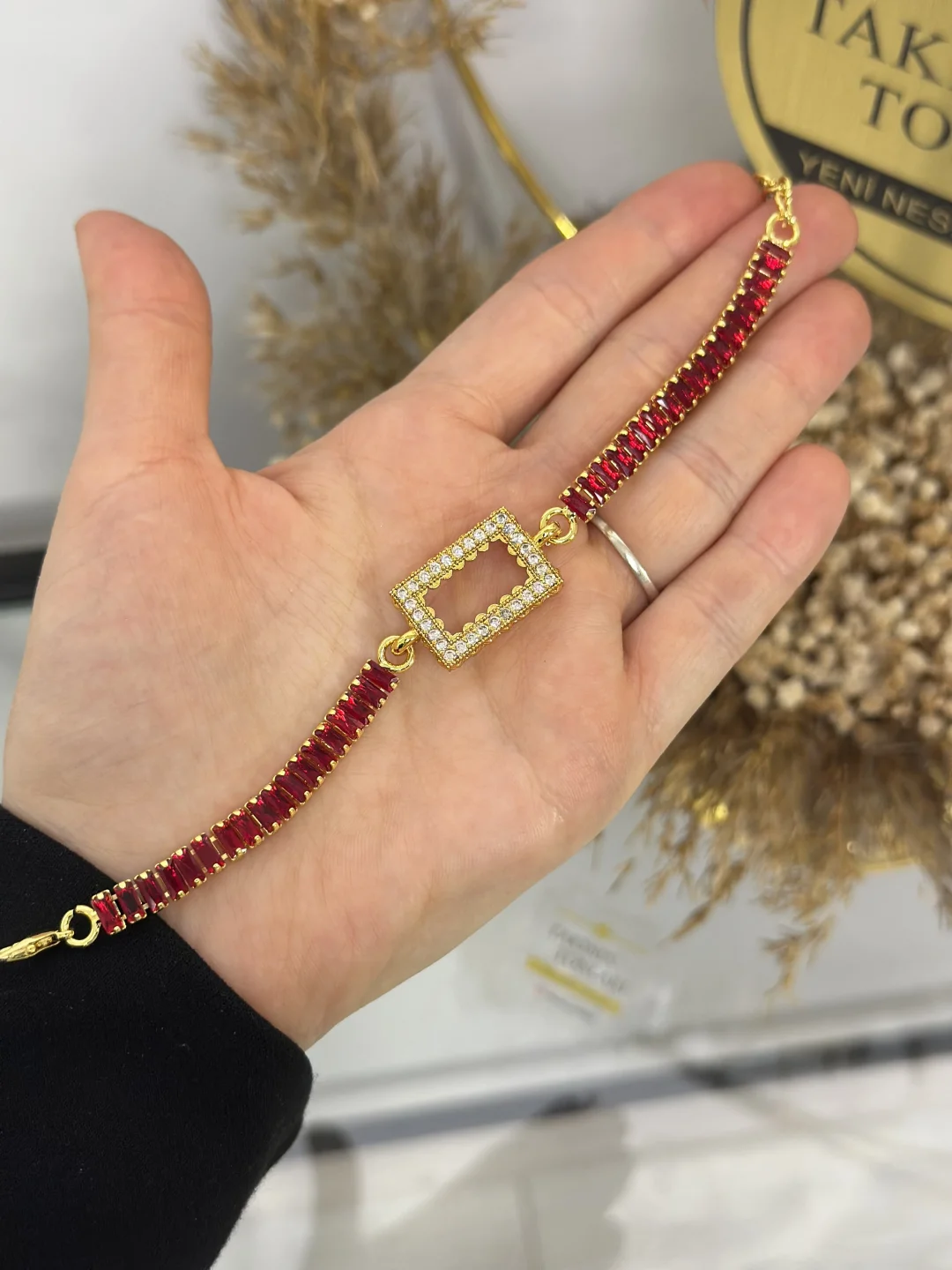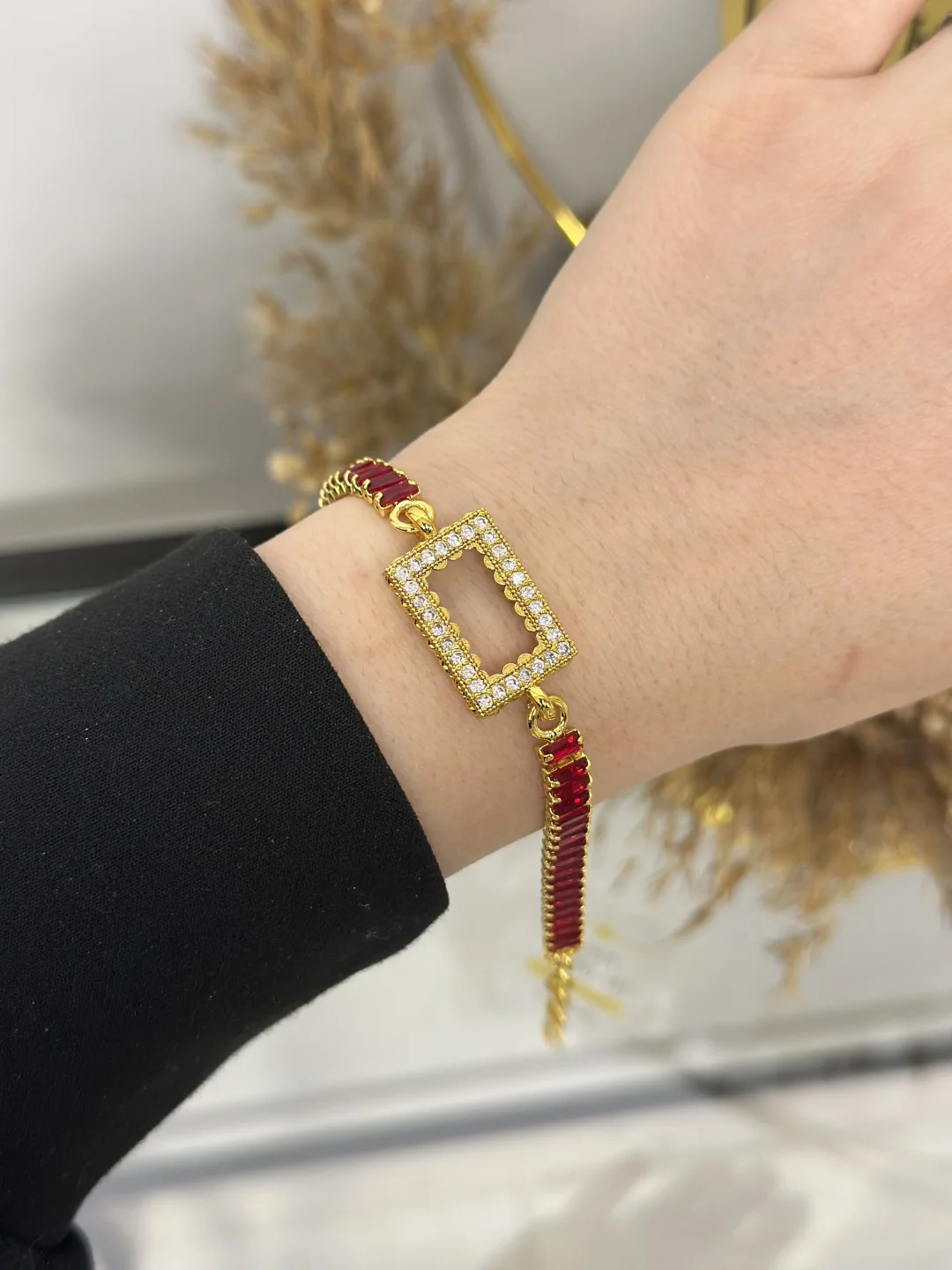 Bu bileklik, yan yana dizilmiş dikdörtgen (baget) kırmızı taşların oluşturduğu ateşli bir su yolu görünümündedir. Merkezindeki taşlı dikdörtgen çerçeve, standart 1 gramlık külçe altınınızı içine alarak, yatırımınızı paha biçilemez bir mücevher gibi göstermenizi sağlar.