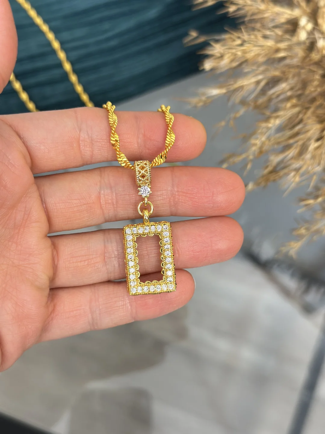 Zirkon Taşlı Çerçeve: Gram altınınızı kusursuzca saracak olan dikdörtgen çerçeve, etrafına mıhlanmış parlak beyaz zirkon taşlarıyla merkeze şık ve aydınlık bir vurgu yapar.