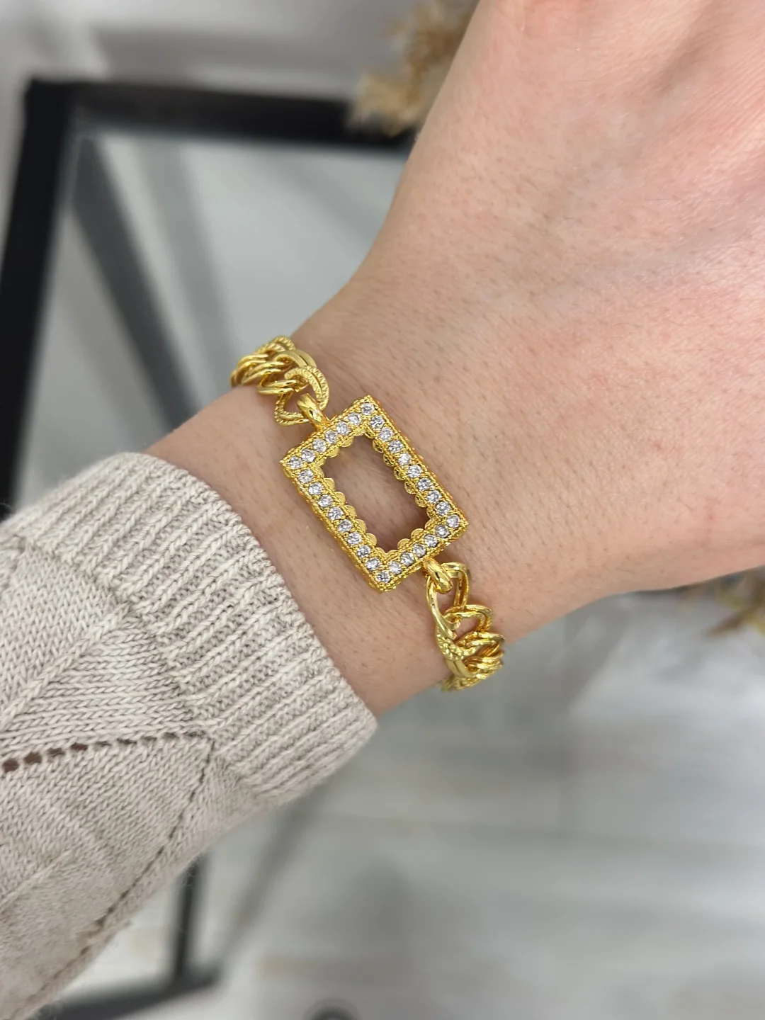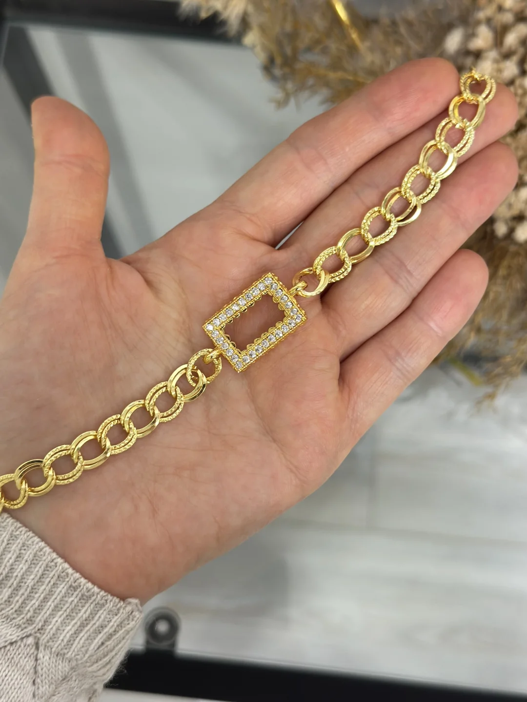 Klasiklerin efsanesi bileğinizde! 1 Adet 1 Gramlık (Dikdörtgen) külçe altın kapasiteli, özel Samanyolu (Uzay Yolu) zincir tasarımlı gold bileklik. Taşlı dikdörtgen çerçevesi ve dolgun zincir yapısıyla hem yatırımınızı sergileyen hem de nostaljik şıklığı günümüze taşıyan 22 ayar altın kaplama boş montür.