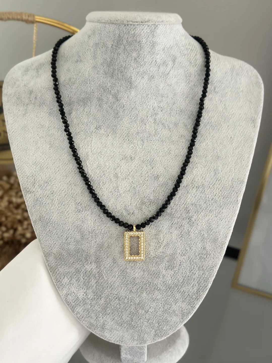 Siyah Kristal Kolye: Faset (kesimli) kristal görünümlü boncuklarıyla ışığı yansıtır, boynunuzda modern ve "ağır" bir duruş sergiler. Ucundaki taşlı çerçeveye 1. gram altınınızı takabilirsiniz.