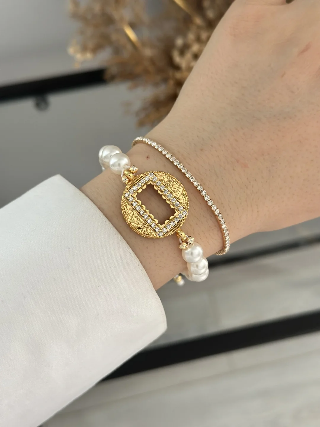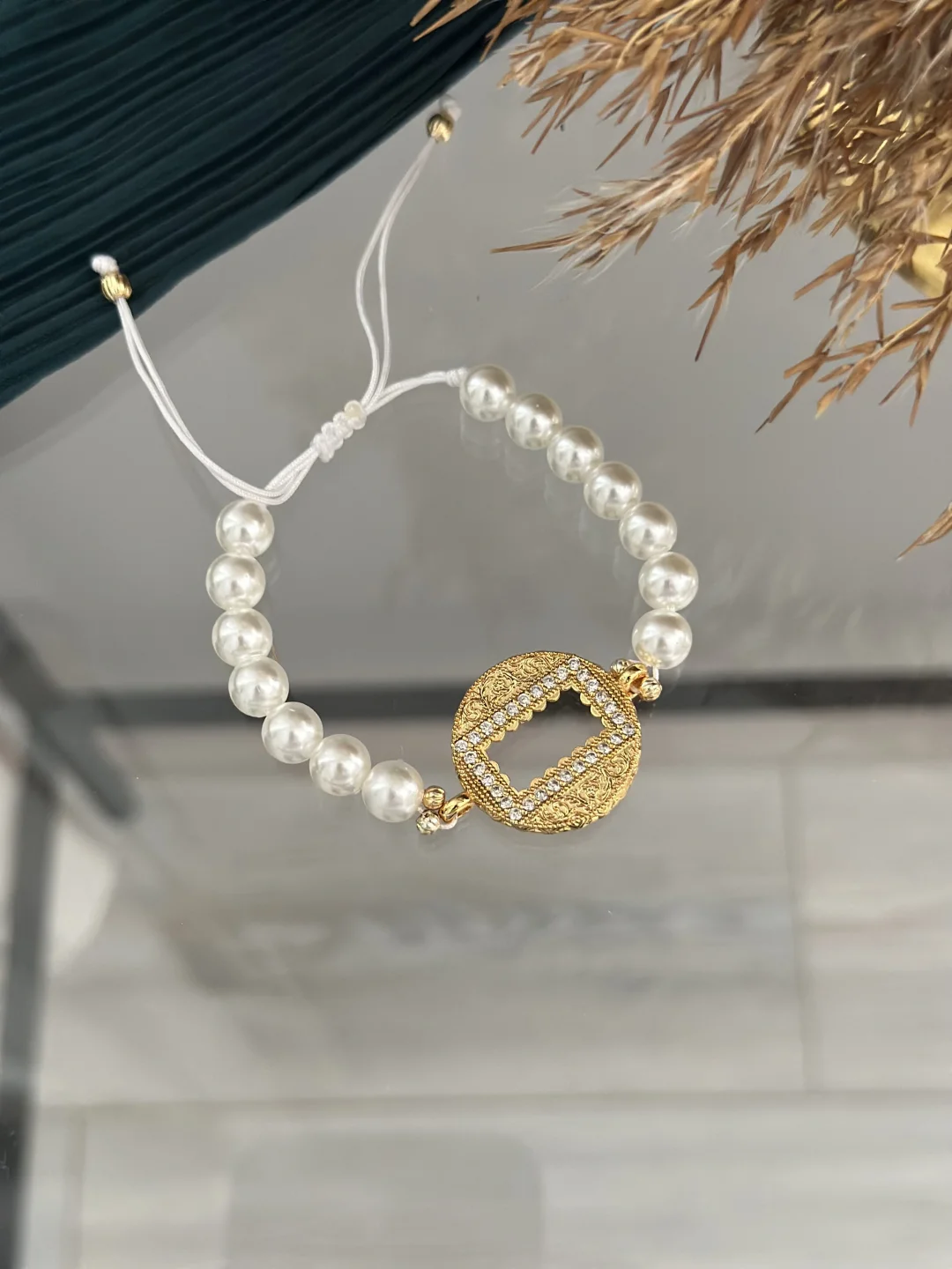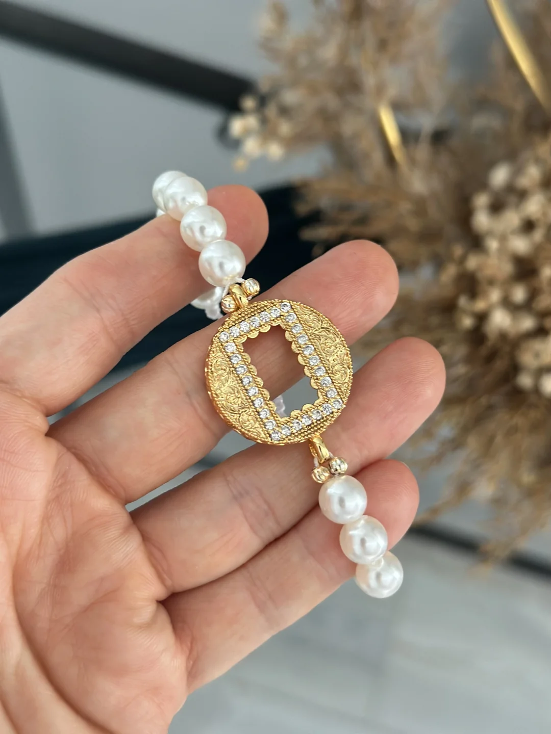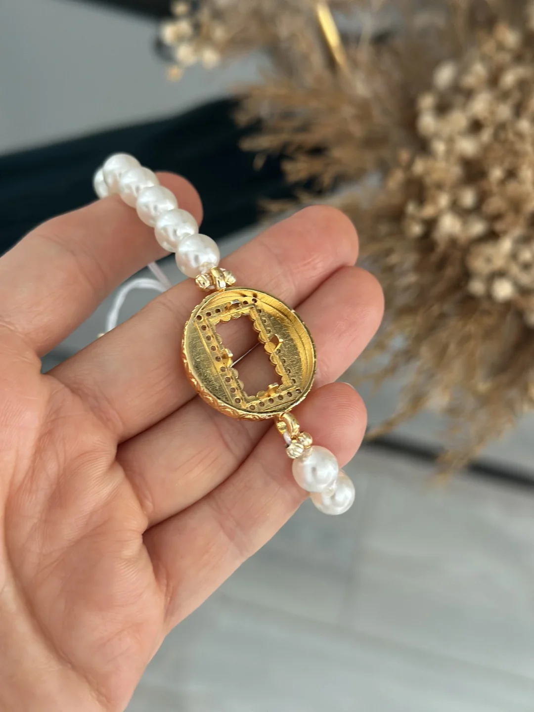 Klasik gram altın yatırımınızı, incinin zamansız asilliğiyle buluşturduk. Bu özel tasarım bileklik, standart dikdörtgen 1 gram altınlarınızı içine yerleştirebileceğiniz işlemeli yuvarlak bir çerçeveye sahiptir. Çerçevenin etrafını saran sedef parlaklığındaki inci görünümlü boncuklar, bileğinizde yumuşak ve şık bir duruş sergiler.