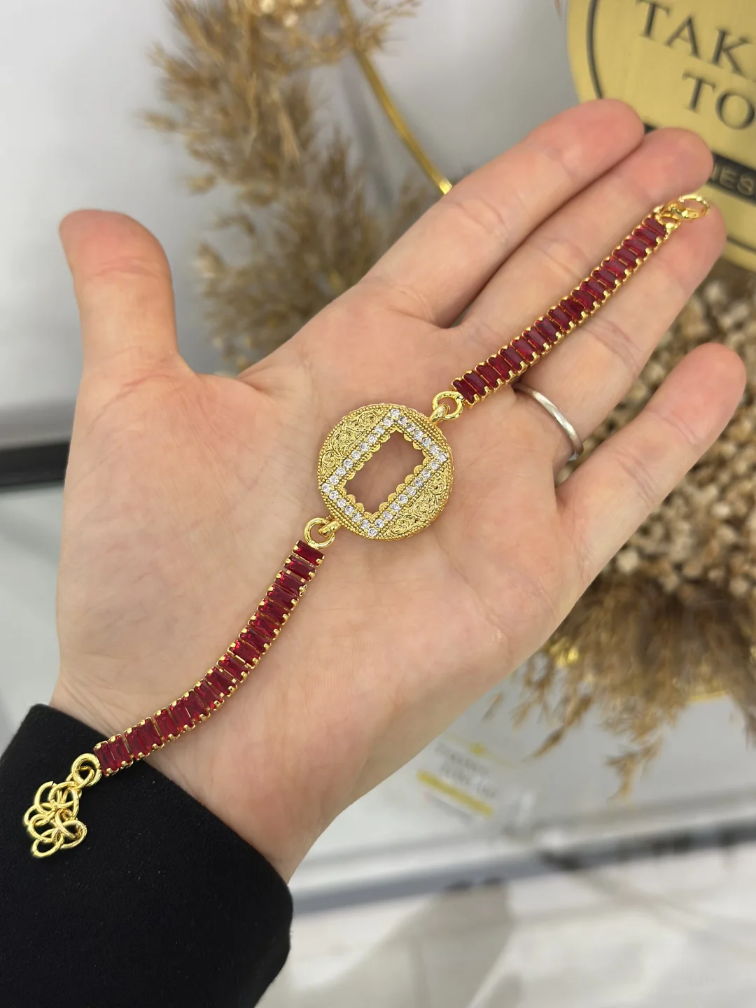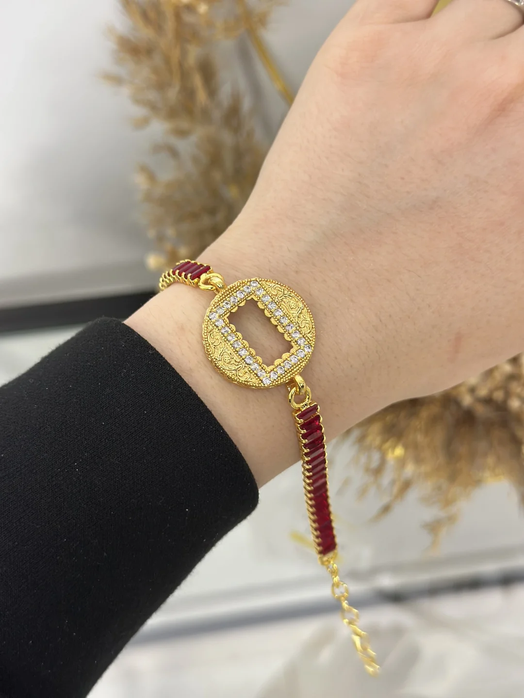 Elinizdeki köşeli dikdörtgen 1 gram altını, bu özel işlemeli yuvarlak yuvaya yerleştirerek, sert hatları gizler ve bileğinizde yumuşak formlu, gösterişli bir madalyon taşırsınız. Kırmızının verdiği enerji ve gold rengin ağırlığı, bu bilekliği özellikle düğünler, kına geceleri ve özel davetler için vazgeçilmez kılar.