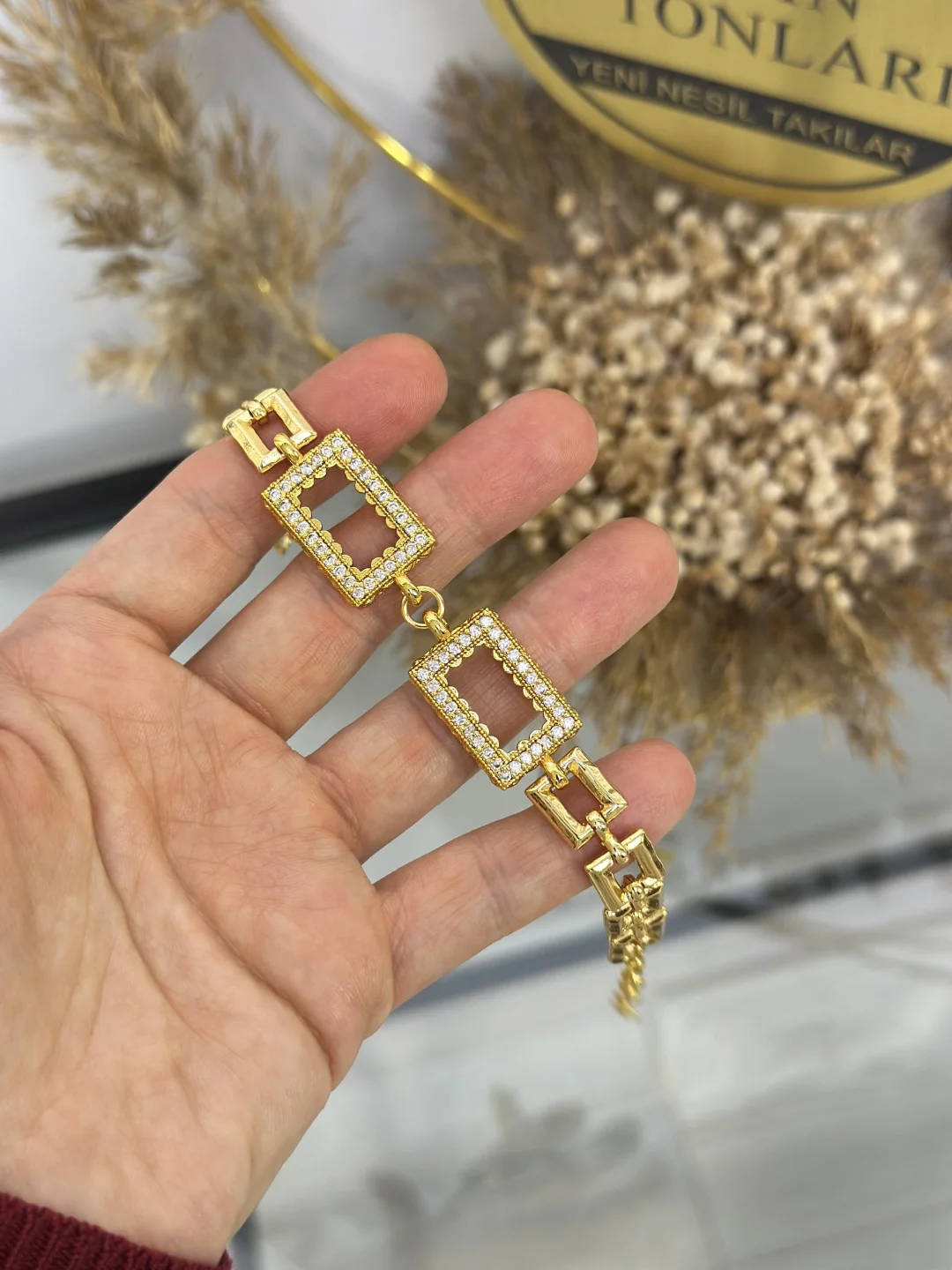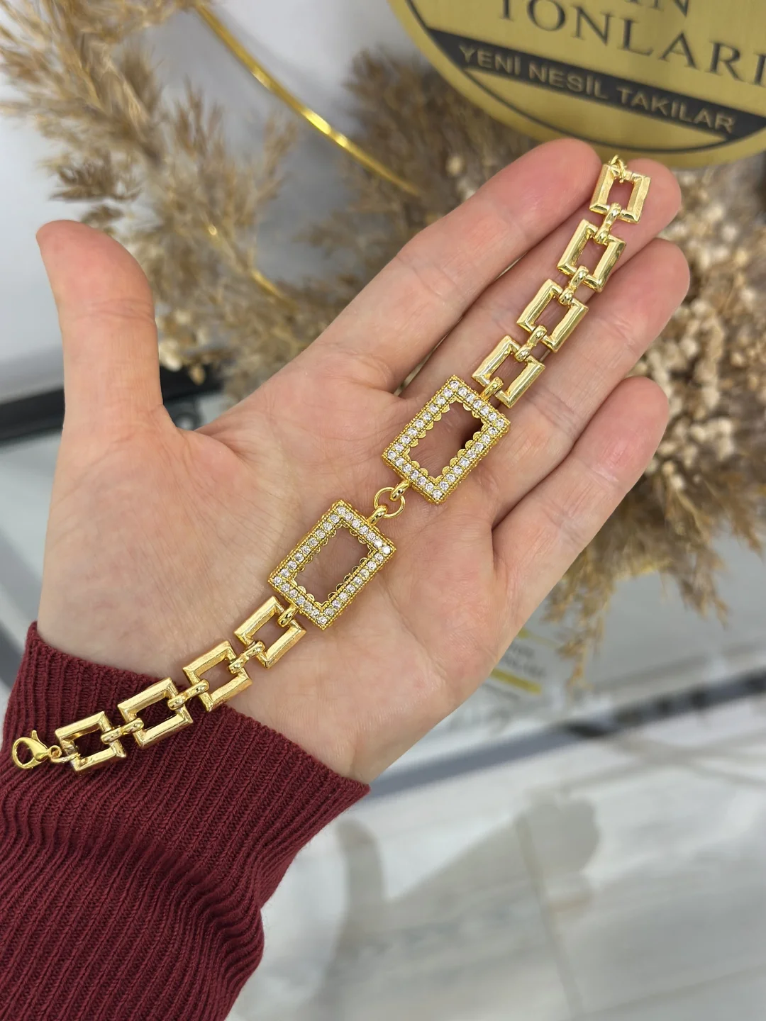 Bilekliğin gövdesi, sıradan zincirlerden farklı olarak Kare/Dikdörtgen Baklalardan oluşur. Bu geometrik yapı, ürüne hem modern bir hava katar hem de bilekte dönme yapmadan "tok" durmasını sağlar. Çerçevelerin etrafındaki zirkon taş işlemeler, içindeki altının değerini görsel olarak yukarı taşır.