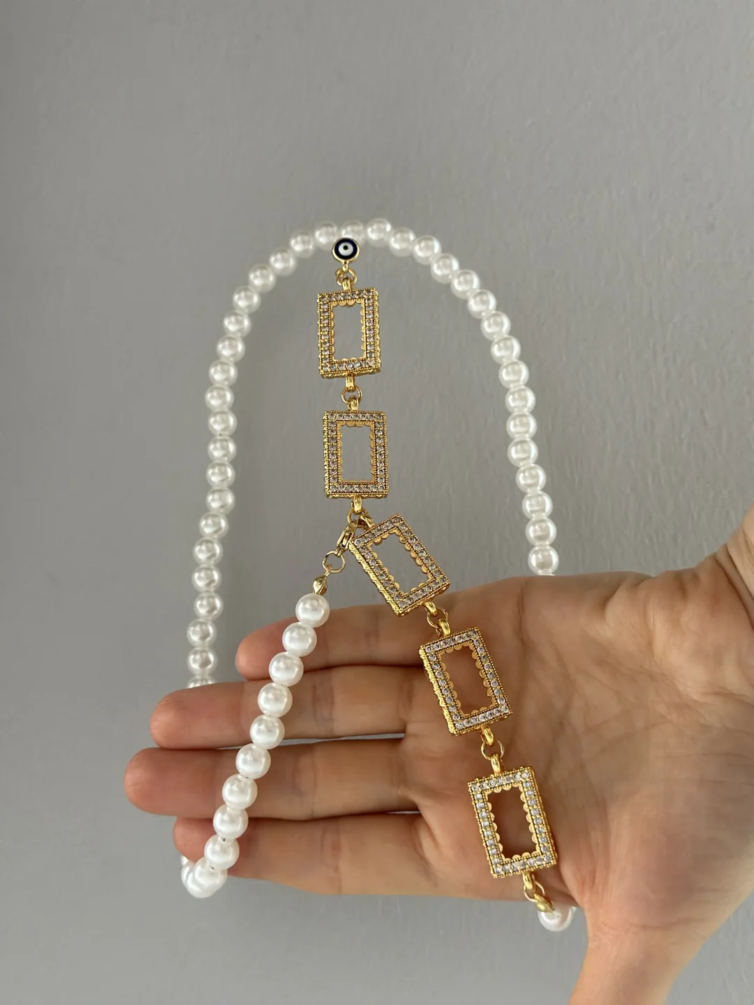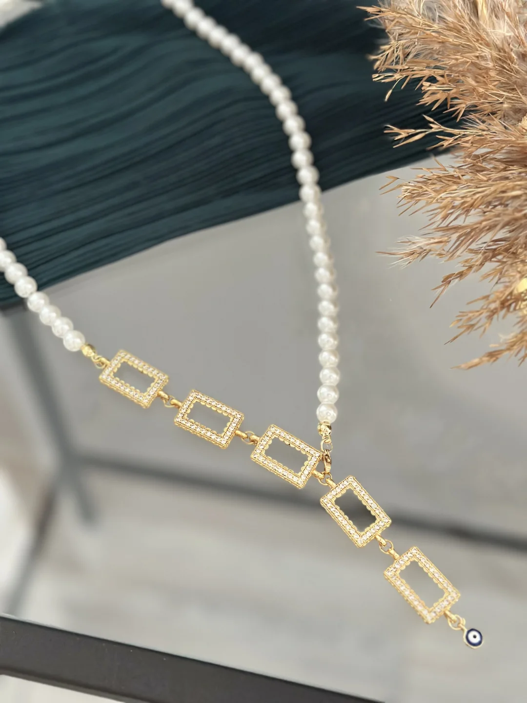 Kolyenin boyun kısmını saran ithal inci görünümlü boncuklar, aşağıya doğru inen ve "Y" formunu oluşturan taşlı altın çerçevelerle birleştiğinde ortaya büyüleyici bir görüntü çıkar. Y formundaki tasarımı sayesinde boynu daha uzun ve zarif gösterir; özellikle V yaka elbiseler ve düğün kıyafetleri üzerinde kusursuz durur.
