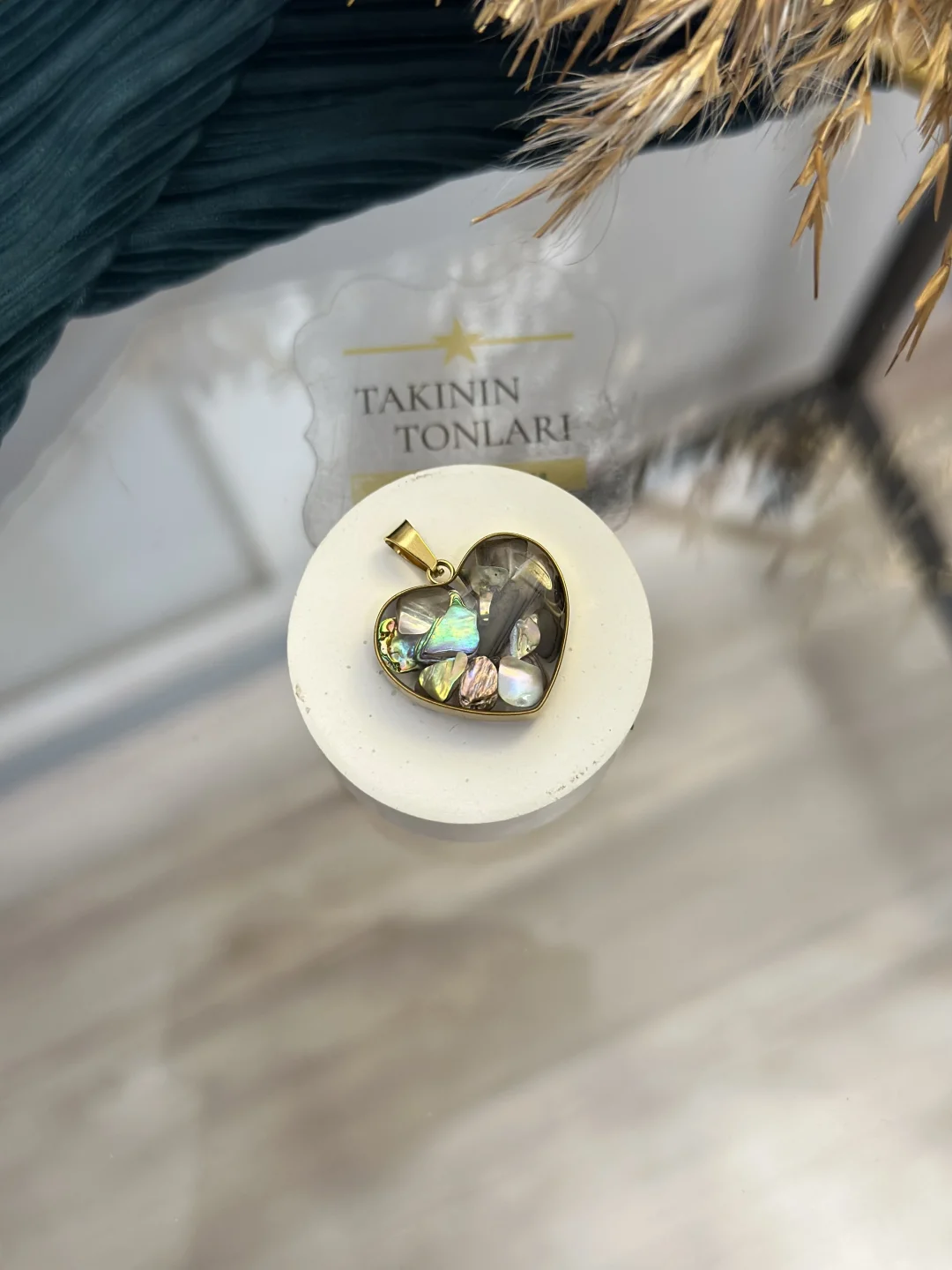 "Sezgi ve Dönüşüm Taşı"! ✨ Bu kalp şeklindeki kolye ucu, ışıltılı gerçek Labradorit taşı parçacıklarından oluşur. Sezgileri güçlendirdiğine ve koruyucu bir kalkan oluşturduğuna inanılır. Kararmaz Paslanmaz Çelik çerçevelidir ve özel bir reçine dolgu ile birleştirilmiştir. Tamamen anti-alerjiktir.