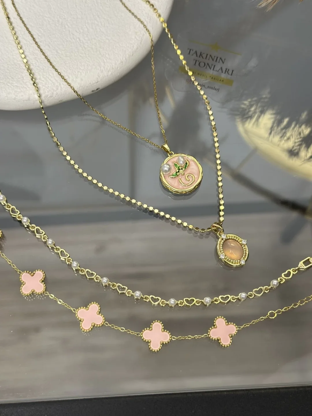 Ezme Pullu Zincir Pembe Taşlı Vintage Kolye (55 cm)