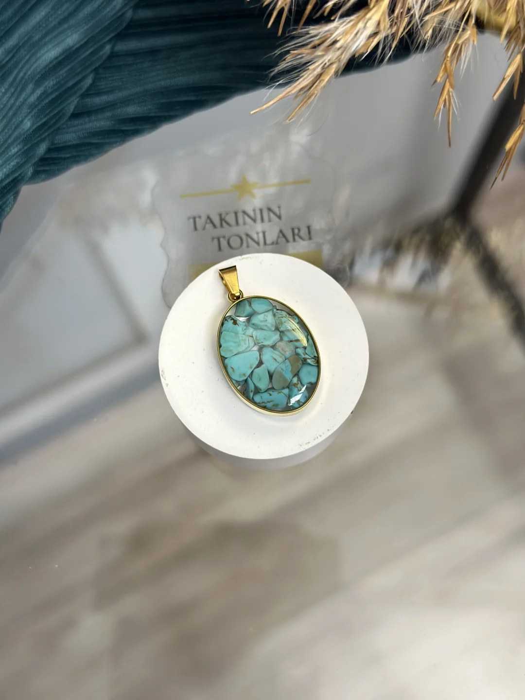 "İletişim ve Nazar Taşı"! ✨ Bu oval şeklindeki kolye ucu, sahibine şans getirdiğine ve nazara karşı koruduğuna inanılan gerçek Turkuaz (Firuze) taşı parçacıklarından oluşur. Kararmaz Paslanmaz Çelik çerçevelidir ve özel bir reçine dolgu ile birleştirilmiştir. Tamamen anti-alerjiktir.