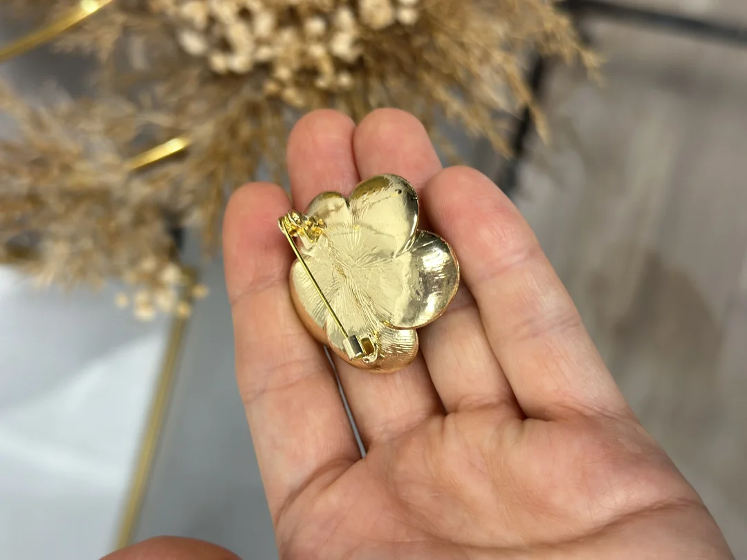 Parlak altın rengi metalden üretilen bu broşun yaprakları, yüksek kaliteli parlak siyah mine (enamel) ile renklendirilmiş ve üç boyutlu bir görünüm kazandırılmıştır.