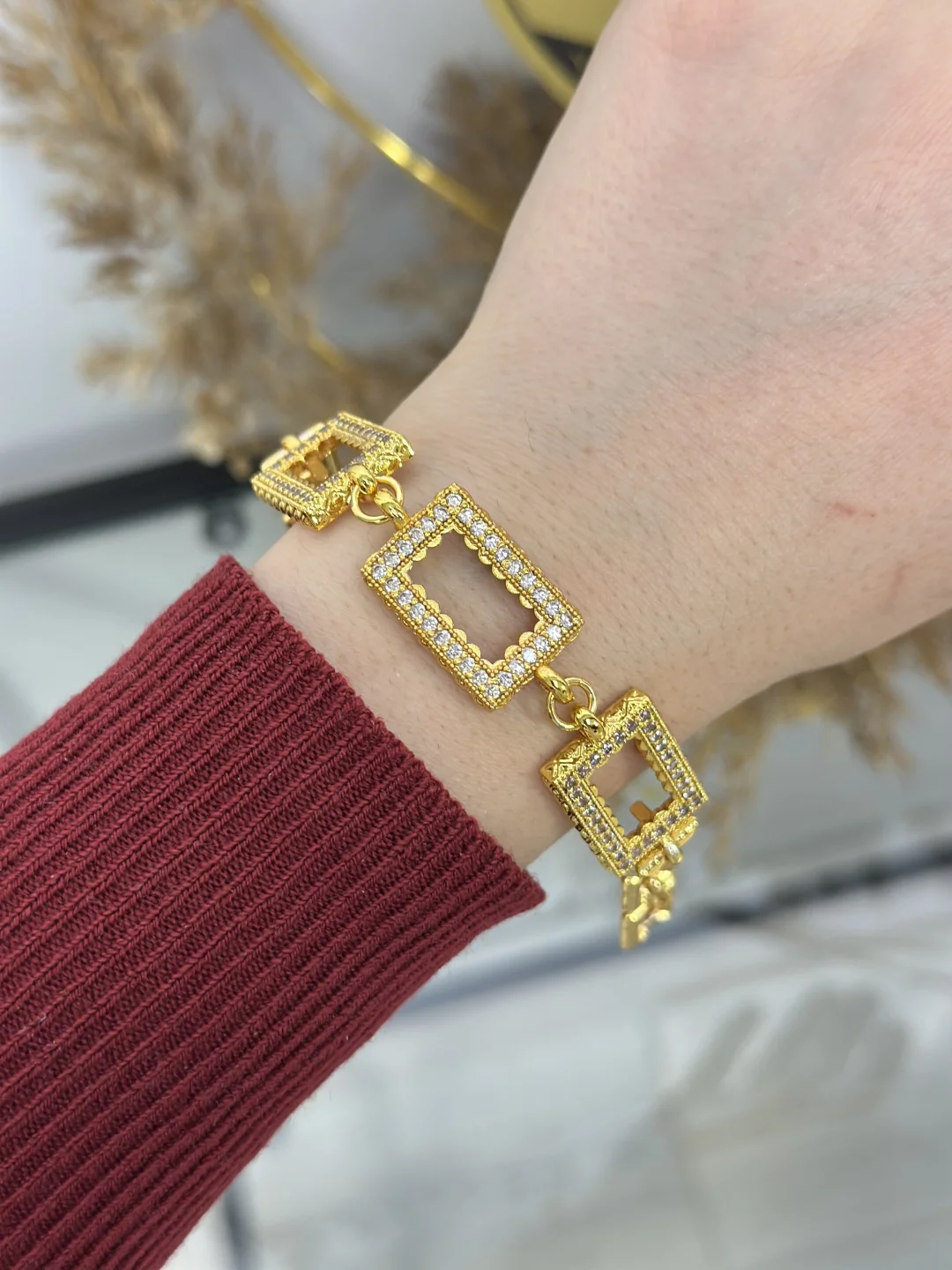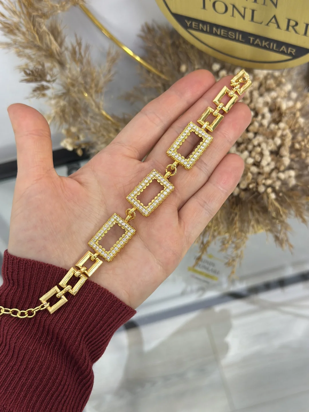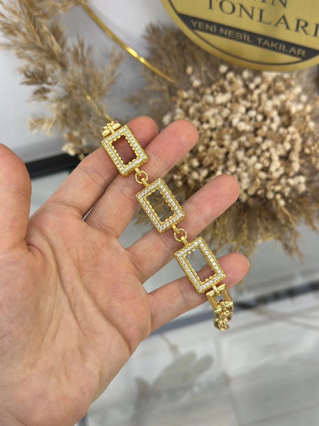 Bu özel tasarımın üzerinde tam 3 Adet Dikdörtgen Gram Altın haznesi bulunur. Birikimlerinizi bu taşlı çerçevelere yerleştirdiğinizde, bilekliğiniz adeta ışıldayan bir gerdanlık havasına bürünür.