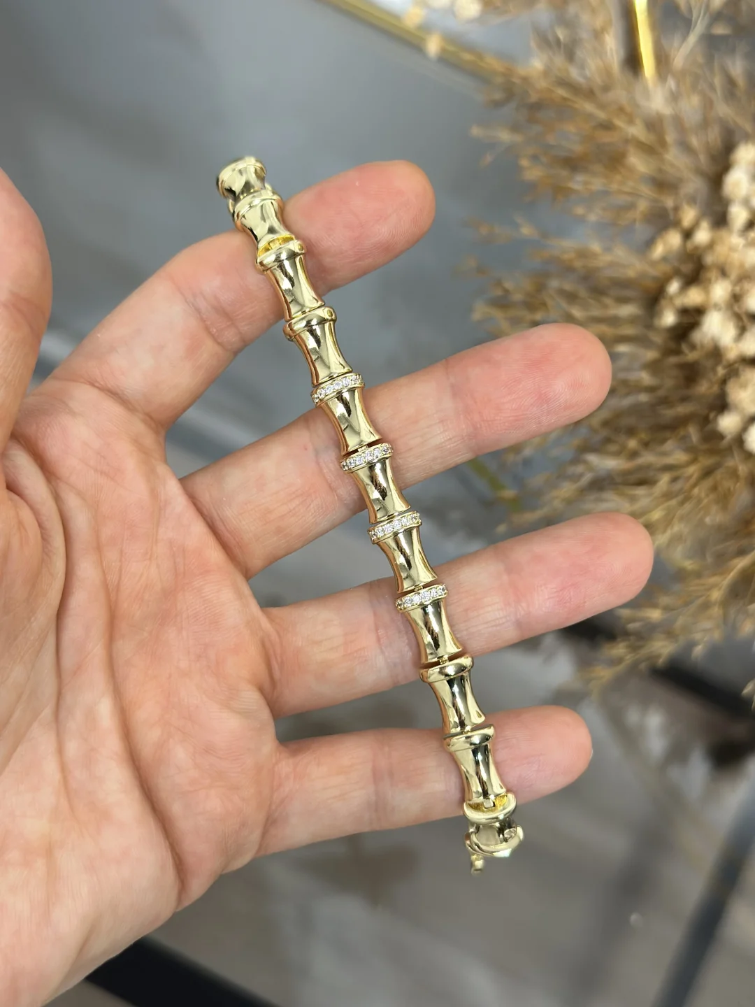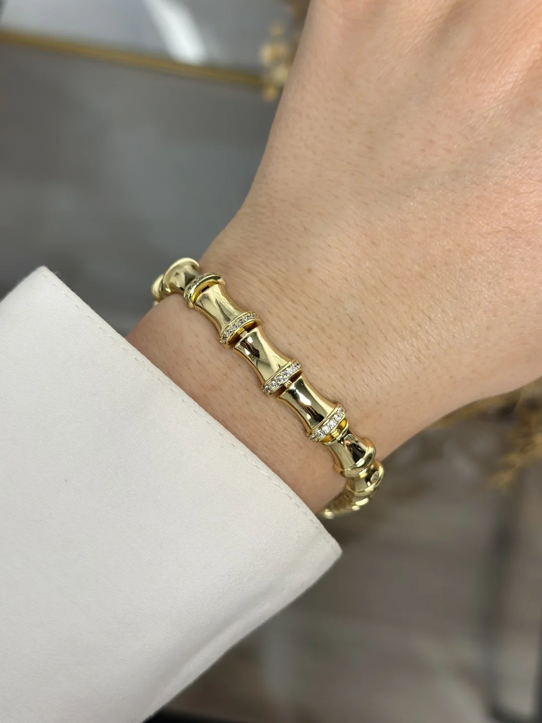 Stilinize ışıltılı ve modern bir dokunuş! Bu özel Xuping bileklik, son dönemin en trend "Kemik" (veya "Bambu") modelini, göz alıcı, pırıl pırıl zirkon taşlarla birleştiriyor.