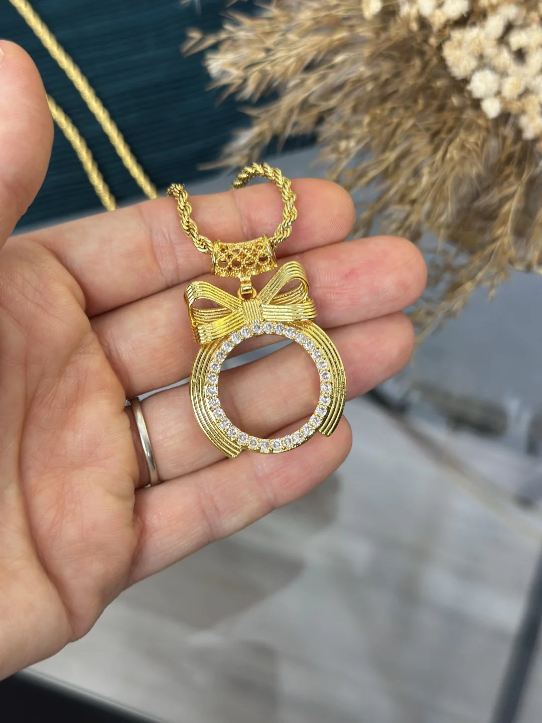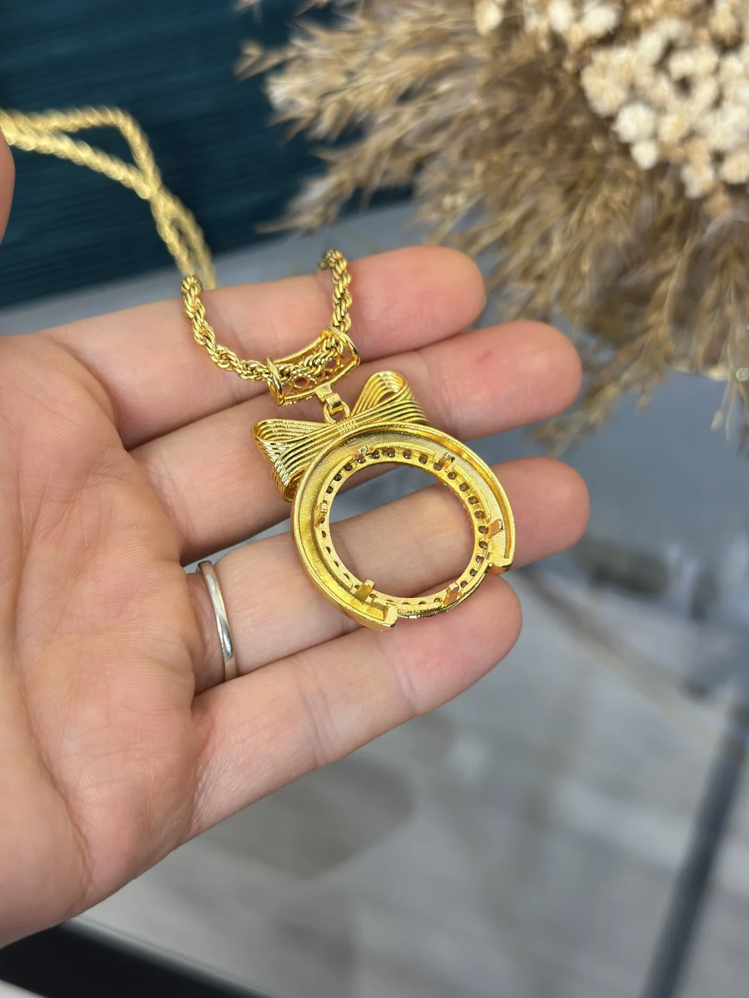 Büyük yatırıma, geleneksel ve devasa gösteriş! Kendi Yarım altınınızı takabileceğiniz; bağlantı noktasındaki Geniş Hasır Kulp, zarif Fiyonk detayı ve zirkon taşlı geniş Kasa tasarımıyla öne çıkan gold kolye. 60 cm uzunluğundaki tok ve dayanıklı Burgu (Halat) Zinciri ile birikiminizi boynunuzda paha biçilemez bir mücevher gibi taşımanızı sağlayan 22 ayar altın kaplama boş montür.