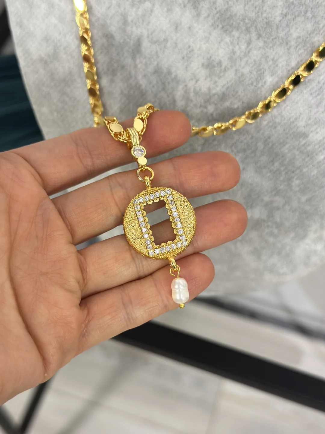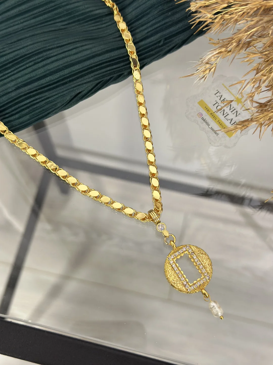 Tasarımın kalbinde yer alan Yuvarlak Madalyon Çerçeve, köşeli 1 gram altınınızı (dikdörtgen) içine alarak ona yumuşak ve estetik bir form kazandırır. Kolyenin en ucundan sarkan Gerçek Doğal İnci ise tasarıma "Saraylı" bir hava katarak, tüm bakışları üzerinize çeker.